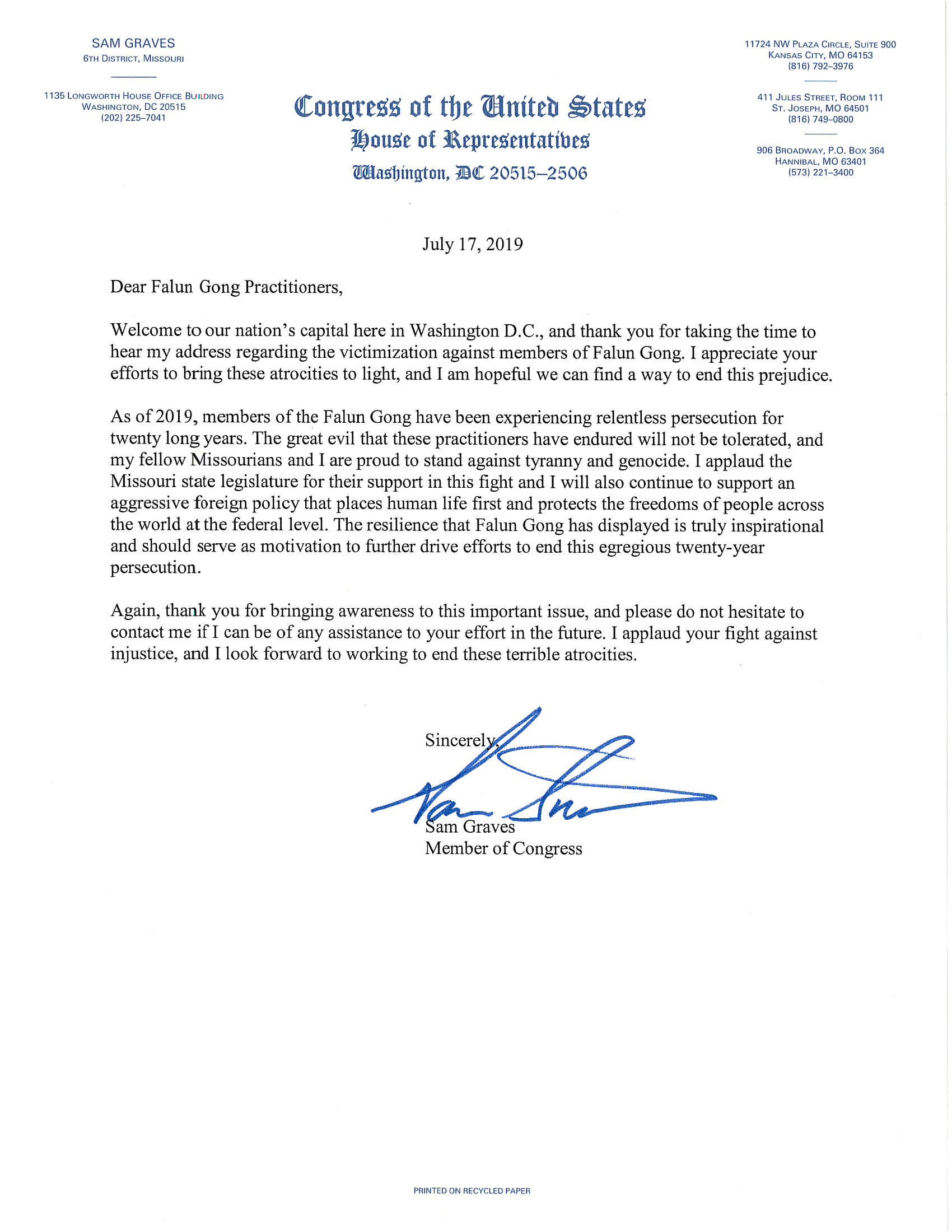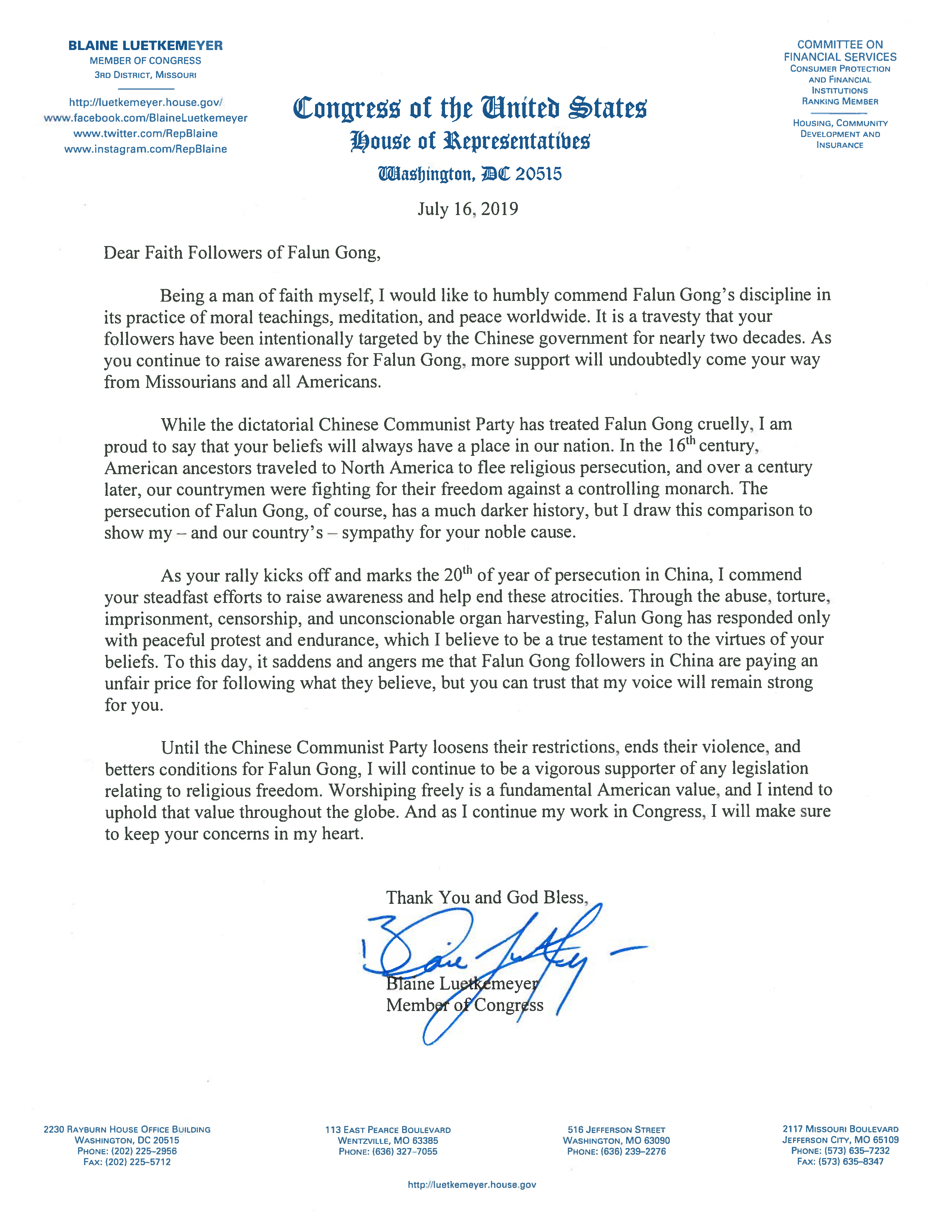 在支持信中,联邦众议员布莱恩‧路特克梅耶(Blaine Luetkemeyer)说:作为一名有信仰的人,我由衷地赞赏法轮功在世界上的道德教导、炼功打坐、宁静平和的修行方式。二十年来中共政府对法轮功学员有目的的迫害实在是荒谬至极。随著你们的努力,更多人了解法轮功,无疑会有越来越多的密苏里人和美国人支持你们。