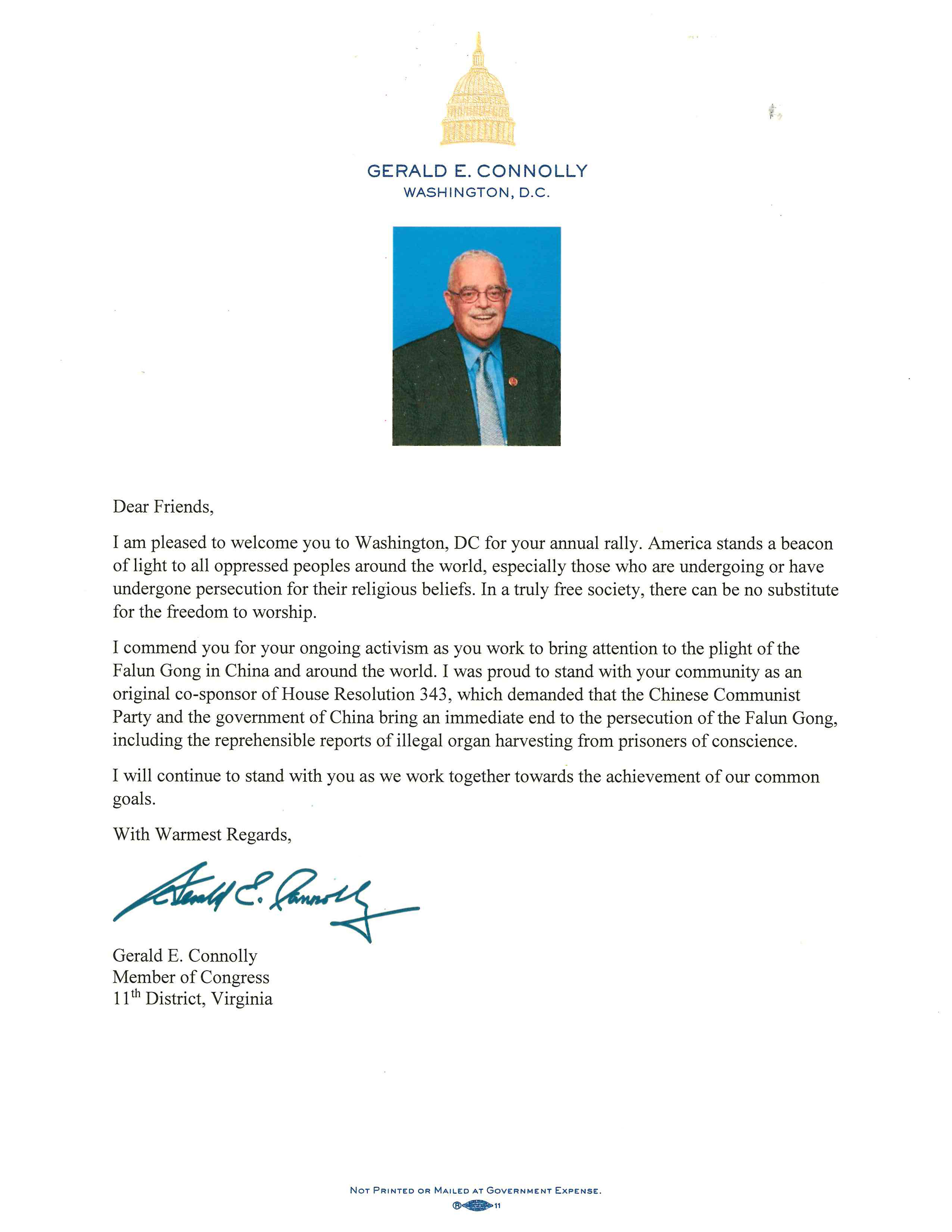 在信中,联邦众议员杰拉德‧康诺利(Gerald Connolly)说:很高兴欢迎你们来到华盛顿特区参加年度集会。对于全世界受压迫的民众──特别是那些正在、或曾经因宗教信仰遭受迫害的人来说,美国有如一座屹立的灯塔。在一个真正自由的社会,没有什么可以取代对自由的崇尚。
