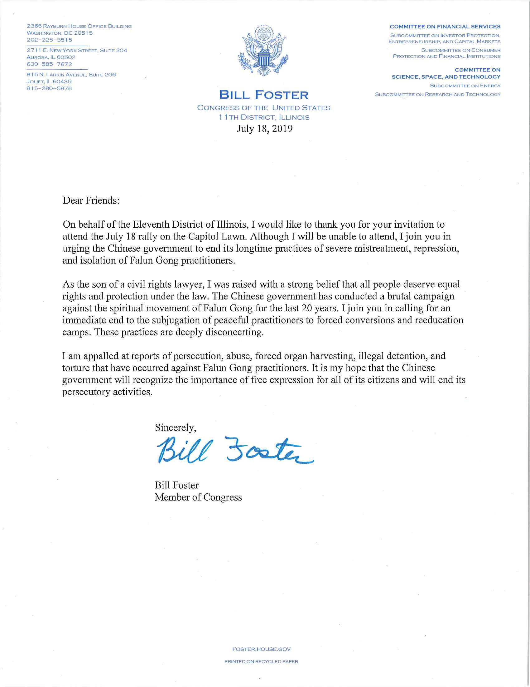 在信中,联邦众议员比尔‧佛斯特(Bill Foster)说:我与你们一起敦促中共当局,停止其对法轮功学员长期的残酷虐待、镇压和孤立行为。