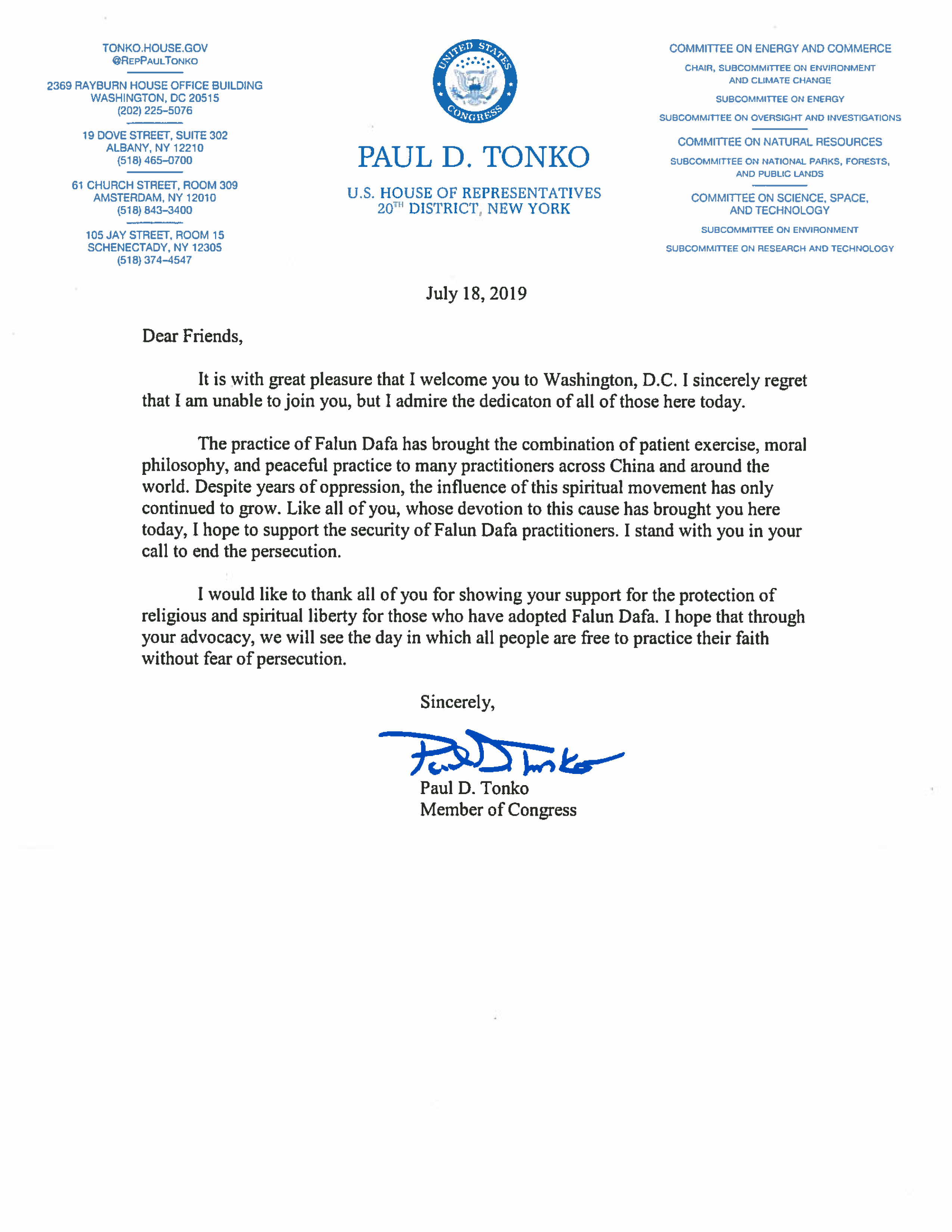 在信中,联邦众议员保罗‧唐科(Paul Tonko)说:法轮大法将耐心修炼、道德理念与平和实践相结合,带给了中国和世界各地的众多修炼者。尽管遭受多年的镇压,但这个信仰团体的影响却在持续扩大。
