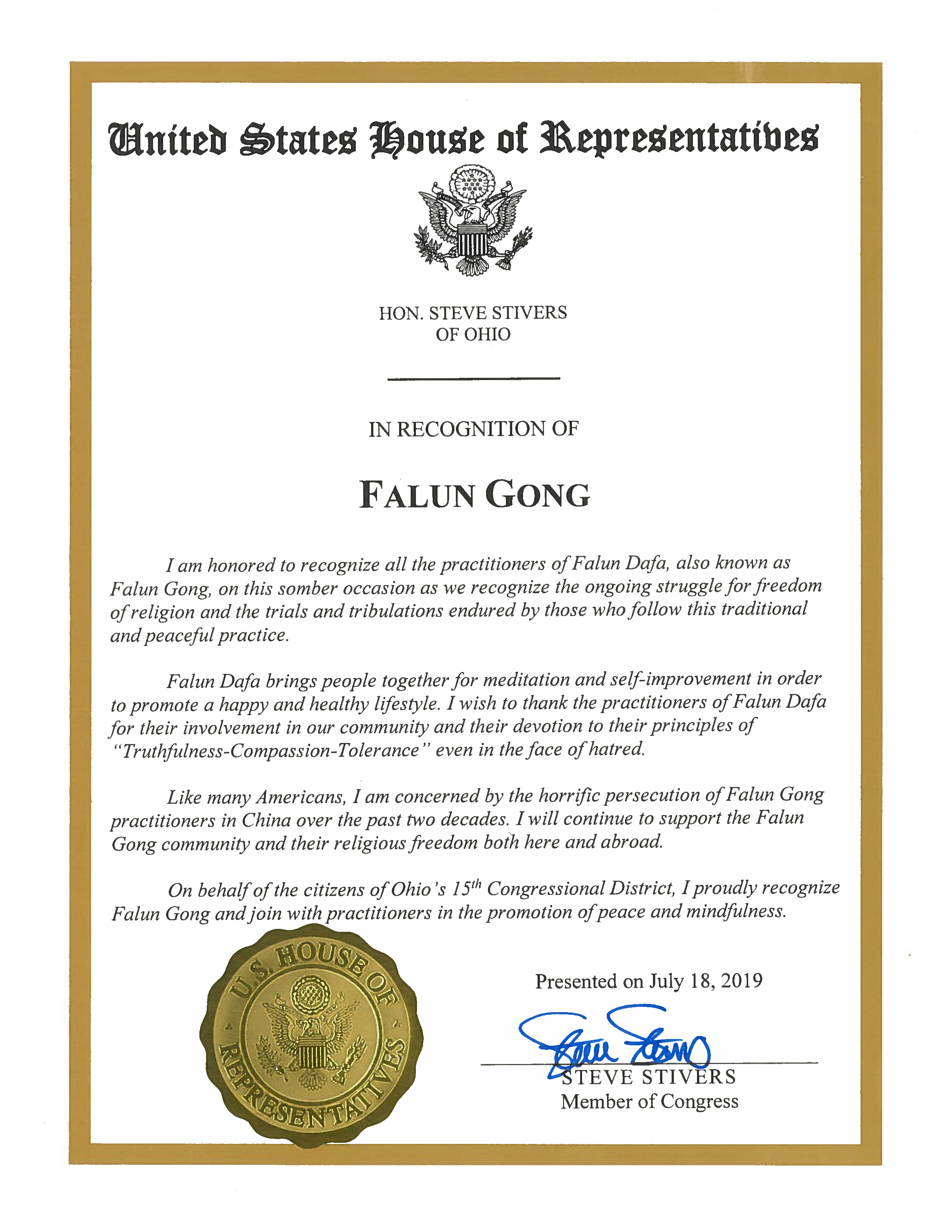 在信中,联邦众议员斯蒂夫‧斯蒂沃斯(Steve Stivers)说:我很荣幸能够在这个严肃的场合表彰所有法轮大法(法轮功)修炼者,我们都知道为了宗教信仰自由正在进行的抗争,以及那些遵循这种传统平和修炼的人所遭的考验与磨难。