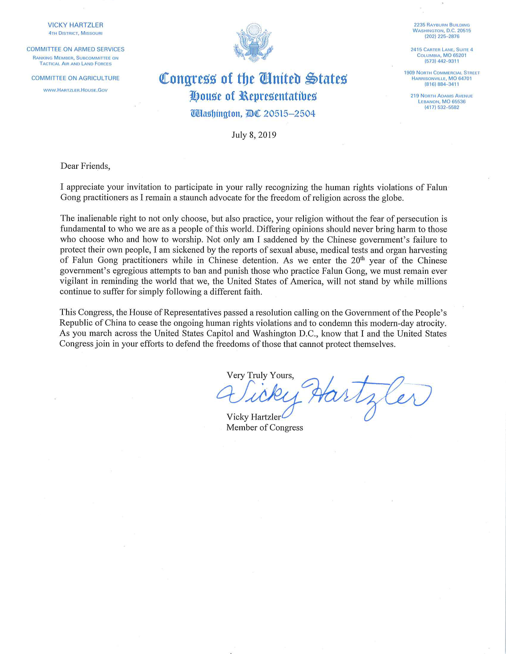 在信中,联邦众议员维基‧哈兹勒(Vicky Hartzler)说:我不仅因为中共政府未能保护自己的人民而感到难过,而且对法轮功学员在中国被拘押期间遭受性虐待、人体试验和器官摘取的报导感到愤怒震惊。在中共政府严厉禁止和惩罚法轮功学员的第二十年之际,在数百万民众只因遵循不同的信仰而持续遭受痛苦之时,我们必须始终保持警惕并提醒全世界,美国不会袖手旁观。