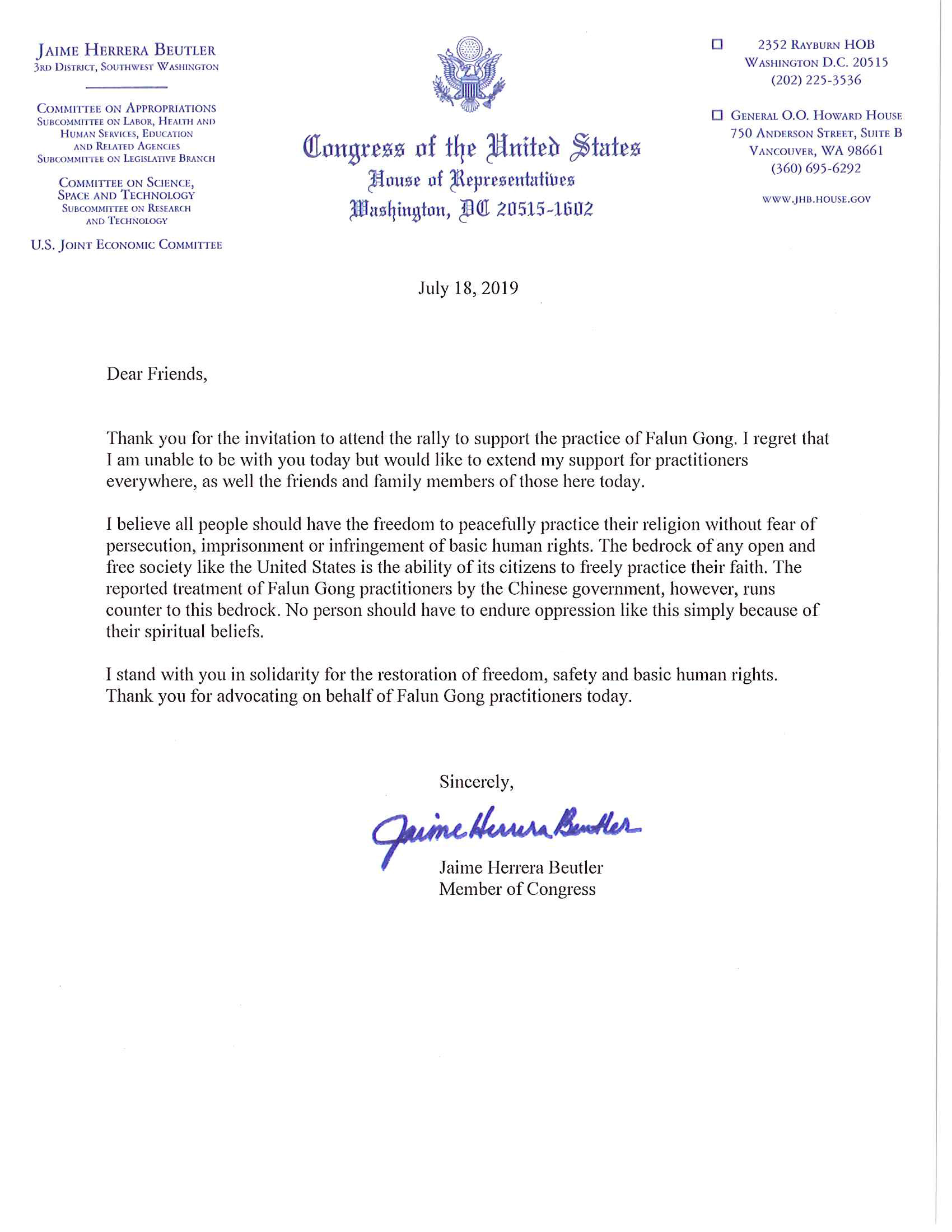 在信中,联邦众议员洁米‧赫雷拉‧布特勒(Jaime Herrera Beutler)说:我相信所有人都应该有和平实践自己精神信仰的自由,没有被迫害、被监禁等基本人权被侵犯的恐惧。任何像美国这样开放、自由的社会,都以公民的信仰自由为基石。然而,中共政府对待法轮功学员的方式,与这一根本原则背道而驰。没有人应该为他们的精神信仰而承受这样的压迫。