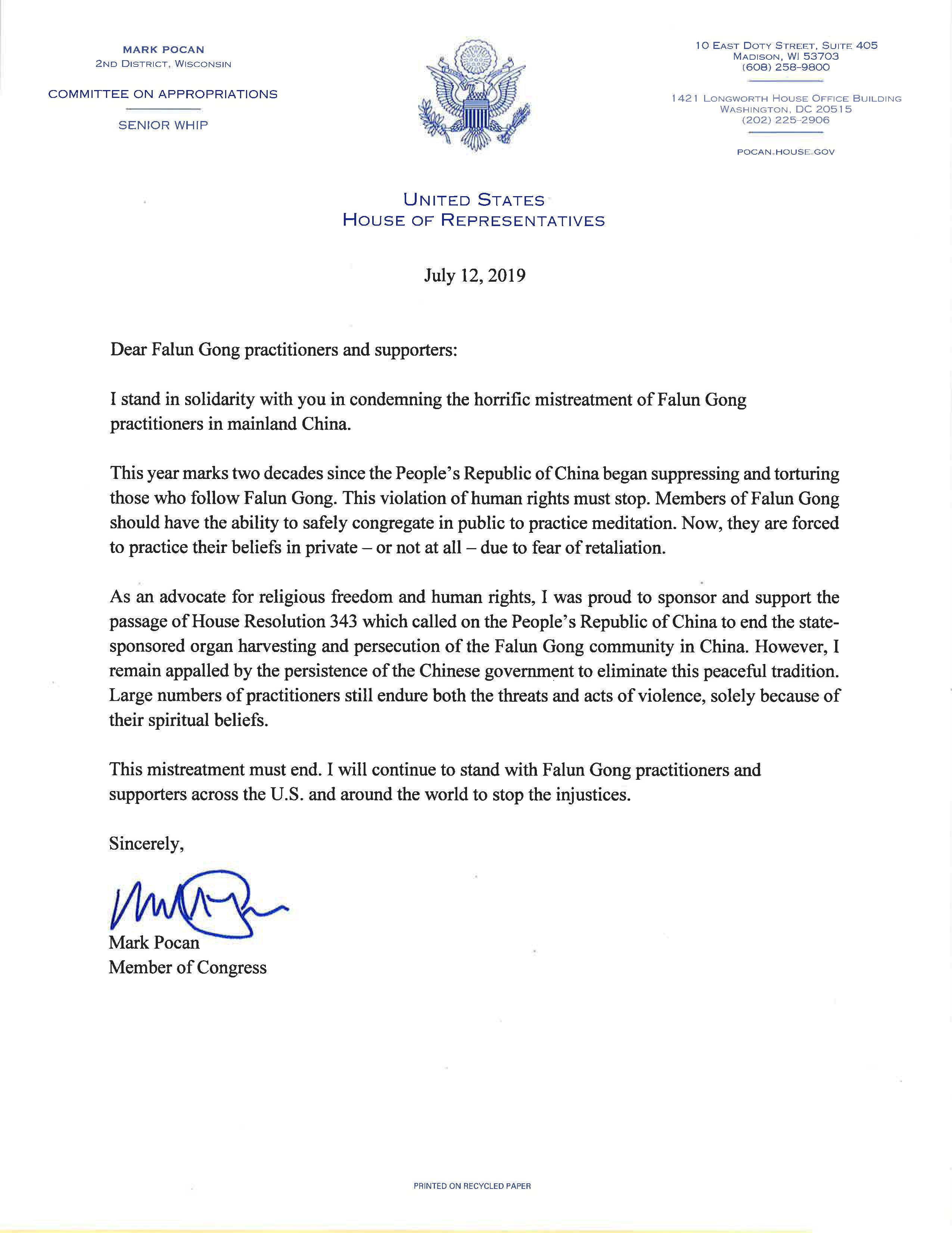 在信中,联邦众议员马克‧波肯(Mark Pocan)说:我和你们站在一起,谴责(中共政府)凌虐中国法轮功学员的恐怖行径。