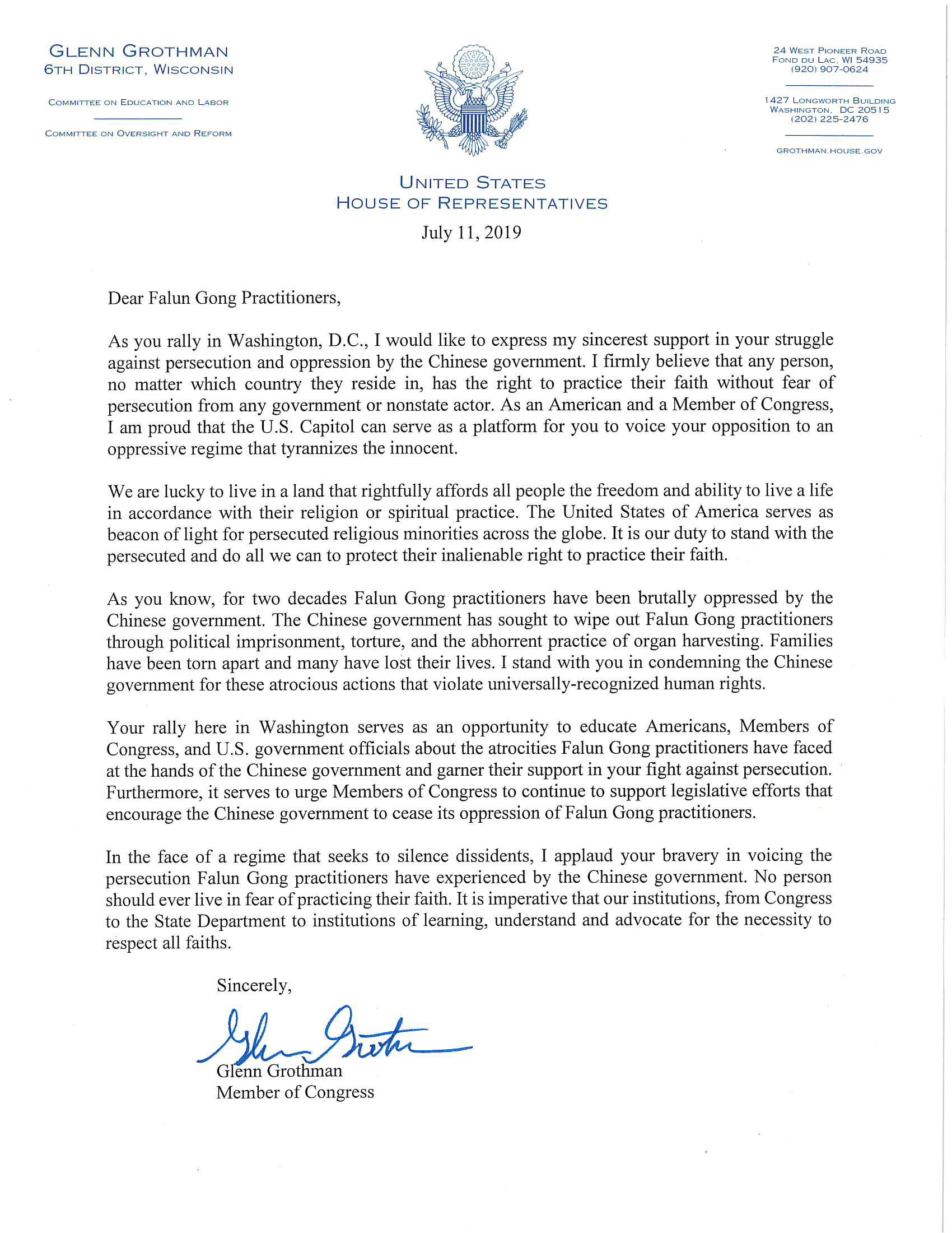 在信中,联邦众议员格伦‧格罗斯曼(Glenn Grothman)说;在你们在华盛顿DC集会之际,对于你们对来自中共政府的迫害和压迫的抗争,我要表达我最真诚的支持。我坚信,无论居住在哪个国家,任何人都有权坚持自己的信仰而不必担心任何政府或非政府组织的迫害。作为一名美国人和国会议员,我感到自豪的是,美国国会可以作为一个平台,为你们表达对一个压迫无辜人民的暴虐政权的反对意见。