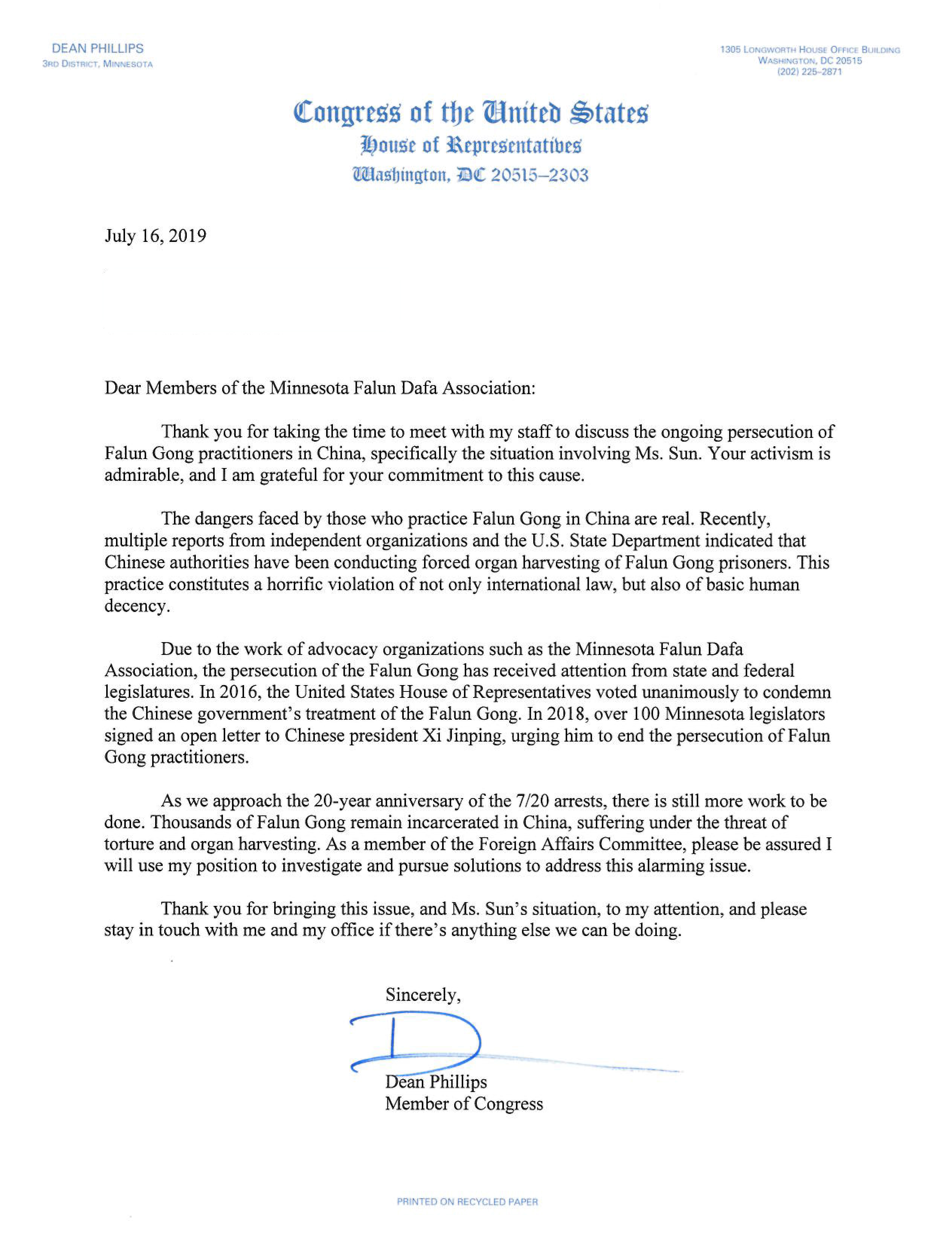 在信中,联邦众议员迪恩‧菲利普斯(Dean Phillips)说:在中国那些修炼法轮功的民众所面临的危险是真实的。最近来自独立组织和美国国务院的多篇报告表明,中共当局一直在强摘法轮功学员器官。这一恐怖行径不仅违反了国际法,而且也侵犯了人类基本尊严。