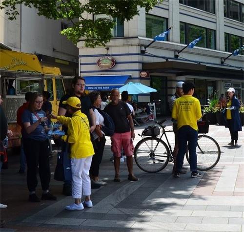 一对祖籍江苏的华人夫妇从温哥华来到西雅图看女儿,恰巧经过法轮功学员的展板,都停下了脚步。太太从学员手中接到各种不同的真相资料,认真的阅读起来,先生也在旁倾听学员讲真相,表示接受。