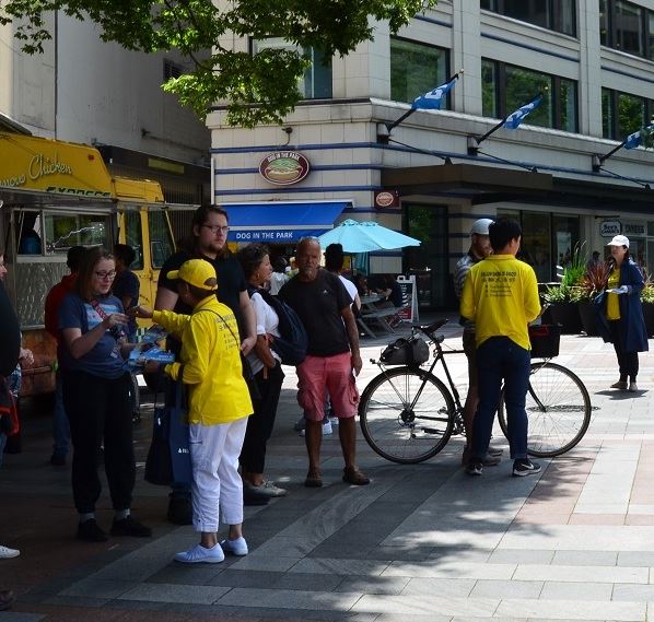 在活动的现场,很多路人都是第一次听说法轮功和被迫害的消息,都表示震惊和愤怒,对法轮功学员多年来坚持讲真相表示感谢,也希望能够给予法轮功帮助。可爱纯真的小学员们也主动向路人递送真相资料,成为一道靓丽的风景。