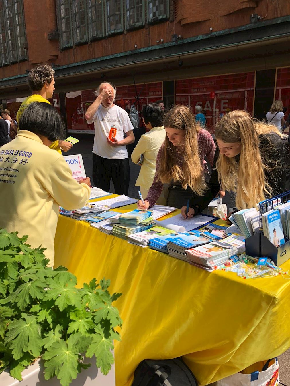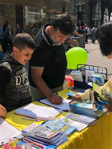 还有一位服装设计师,在荷兰有自己的服装品牌,他目前正想去中国,准备在中国开店,看到我们的征签活动,停下来了解真相,他说以前去过中国几次,只听说中国有不付薪水的奴工,他还持怀疑态度,却没有人跟他说过迫害法轮功和活摘这种事,他认真听完法轮功学员的介绍中国现在经济及人权状况后,郑重地在征签表上签下了自己的名字。