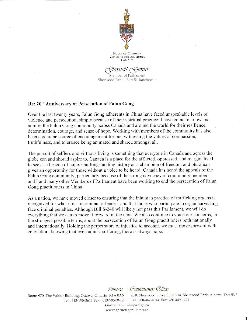 加拿大联邦国会议员杰纽益斯(Garnett Genuis)来信说:“在过去的20年里,中国的法轮功学员面临着无法形容的暴力和迫害,仅仅是因为他们的精神信仰。我在加拿大和世界各地认识了法轮功团体,钦佩他们的韧性,决心,勇气和希望。与法轮功学员合作成了我一个真正的勇气源泉,见证了‘真、善、忍’ 的价值观在所有人之间分享和展现。”