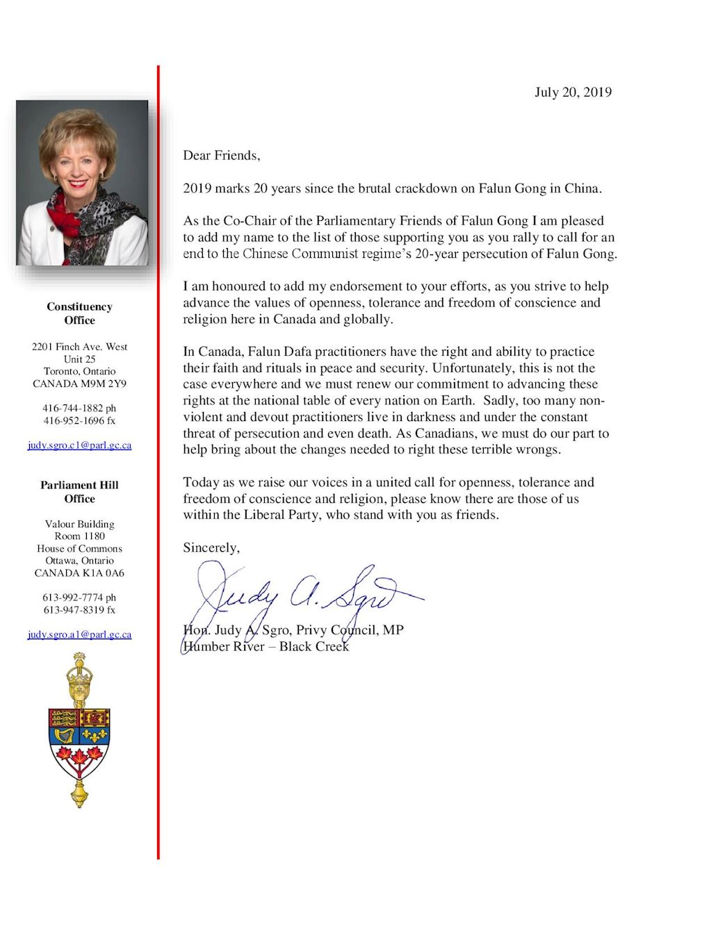 加拿大资深国会议员斯格罗(Judy Sgro)来信说:“2019年标志着中共残酷镇压法轮功已经20年。作为议会法轮功之友的共同主席,在你们集会要求结束中共20年来对法轮功的迫害之时,我很高兴将我的名字加入到支持你们的名单中。”