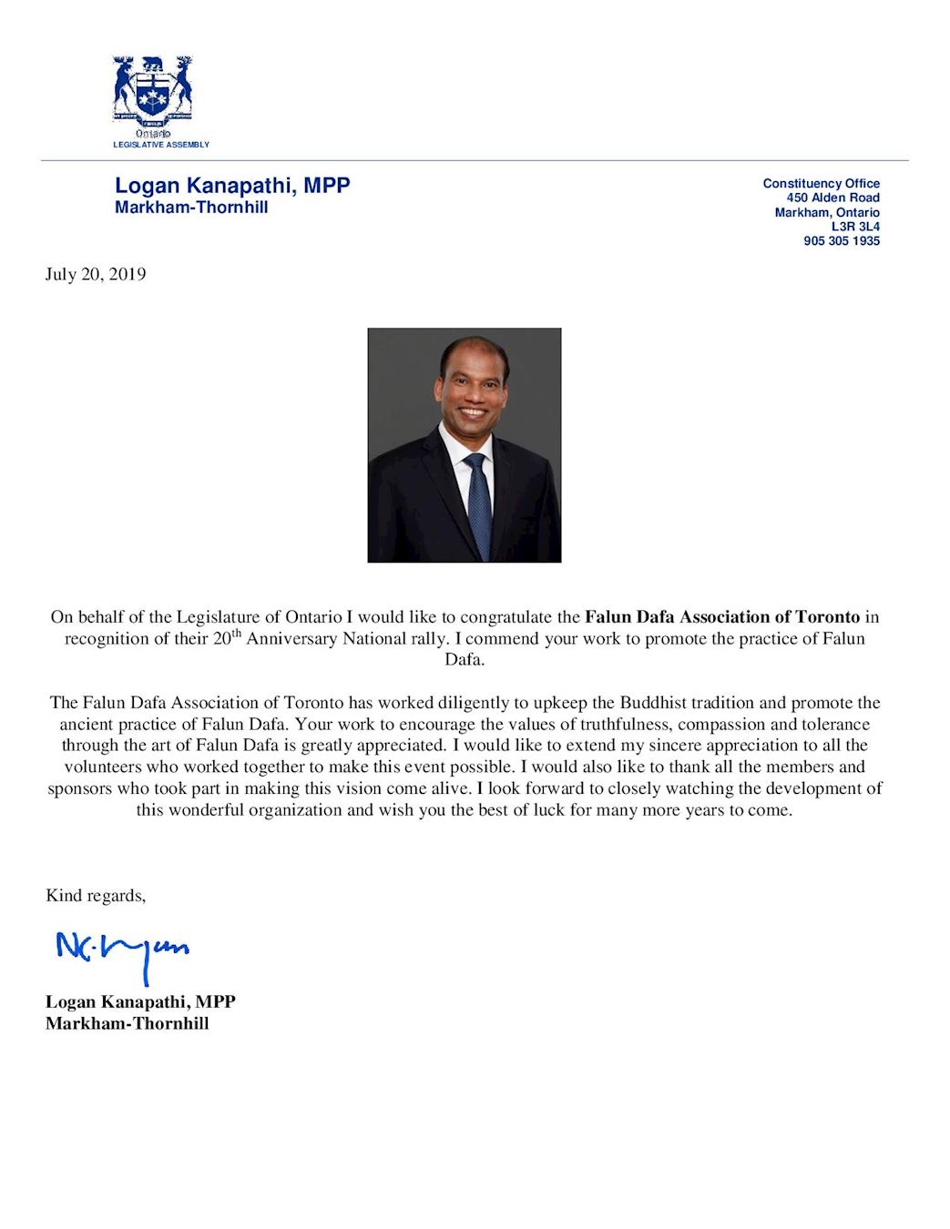 安省议员卡纳帕蒂(Logan Kanapathi)发来支持信,赞扬法轮功学员在加拿大倡导法轮大法。