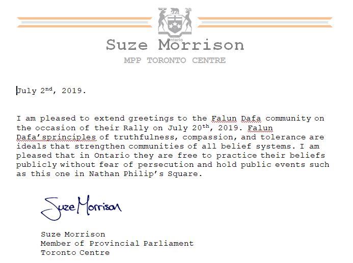 安省省议员莫里森(Suze Morrison)给2019年7月20日的集会发来支持信。“法轮大法的原则‘真、善、忍’,是加强所有信仰体系社区的理想原则。我很高兴法轮功学员在安省可以自由、公开地实践他们的信仰,不必担心受到迫害。”
