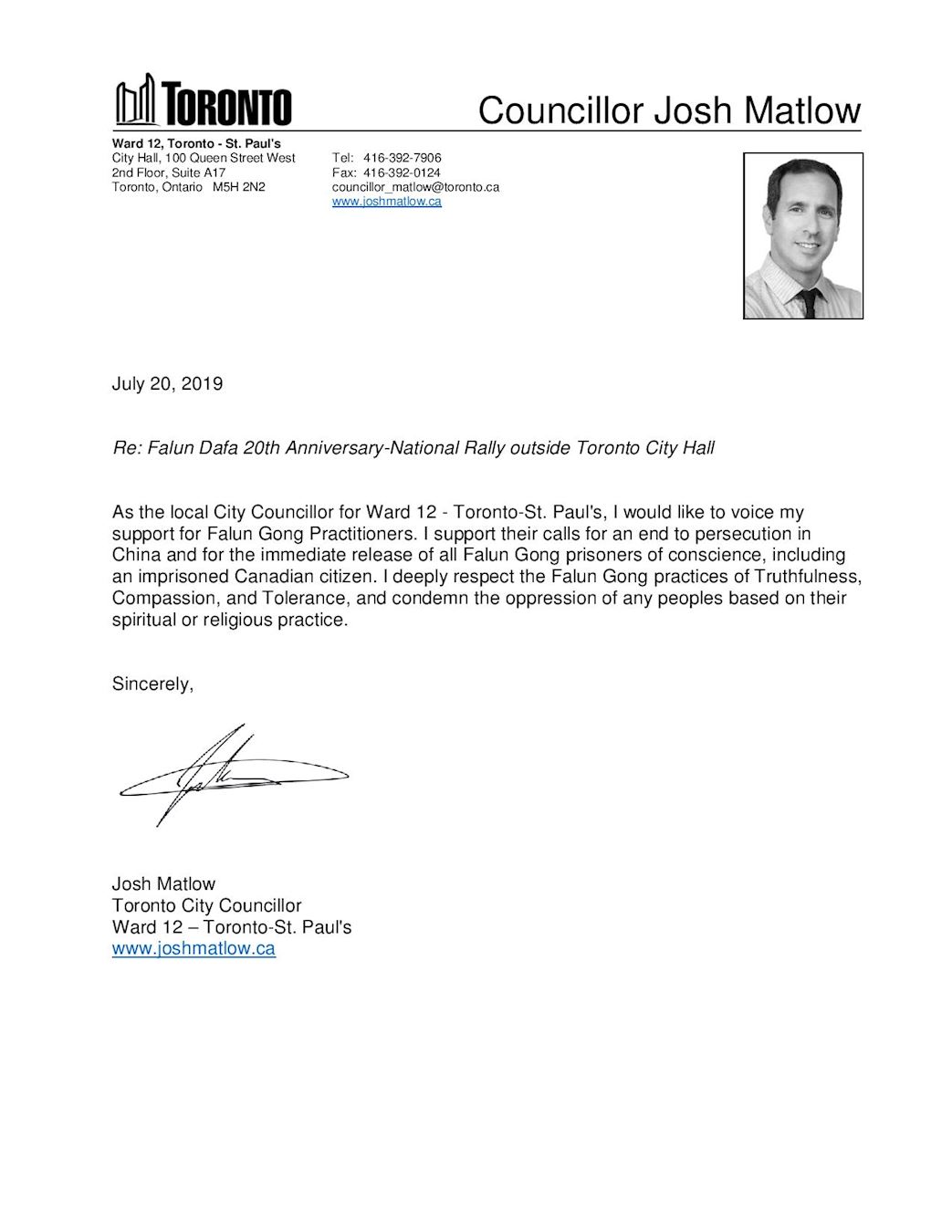 多伦多市议员马特楼(Josh Matlow)在支持信中表示:“作为多伦多市第12选区的市议员,我想表达我对法轮功学员的支持。”