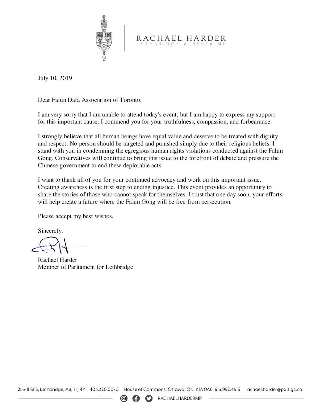 来自亚伯塔省的国会议员哈德(Rachael Harder)在支持信中说:“我很遗憾无法参加今天的活动,但我很高兴地表达我对这一重要事业的支持。我赞扬你们的真、善、忍。”