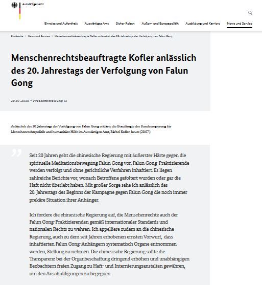 ![]() 图:德国外交部负责人权政策和人道主义援助的专员考夫勒女士(Dr. Baerbel Kofler)谴责中共迫害法轮功的新闻公告(德国外交部网站截图) |