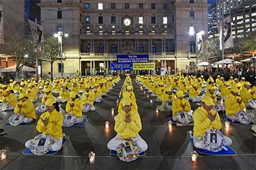 ![]() 图1~2:悉尼法轮功学员在海关大楼前烛光悼念二十年中被中共迫害致死的法轮功学员 |