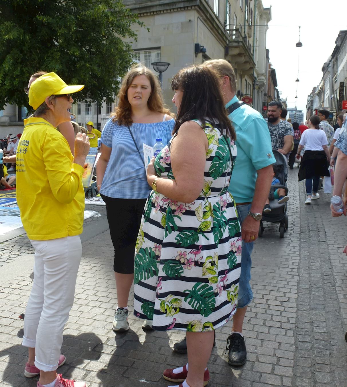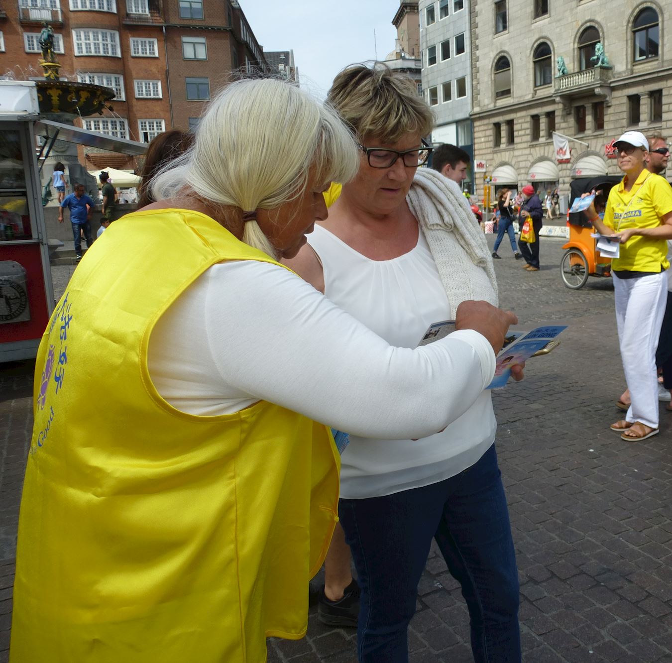 ![]() 图10:丹麦法轮功学员、年届80的德裔女士卡伦(Karen)在给路人讲真相。 |