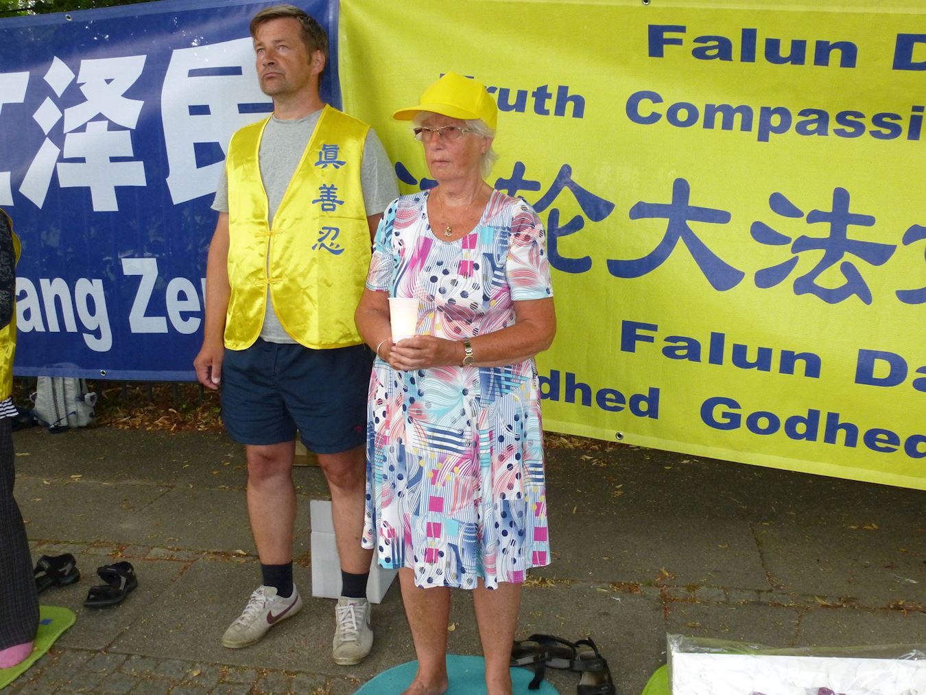 年届八十的德裔女士卡伦(Karen)从1995年开始修炼法轮功,她今天特意从她居住的城市赶来哥本哈根参加反迫害20年纪念活动。她说:“我想向中国人说一句心里话:发生在那里的迫害实在太错了!希望中国人也能够站出来制止这场非法的迫害。”