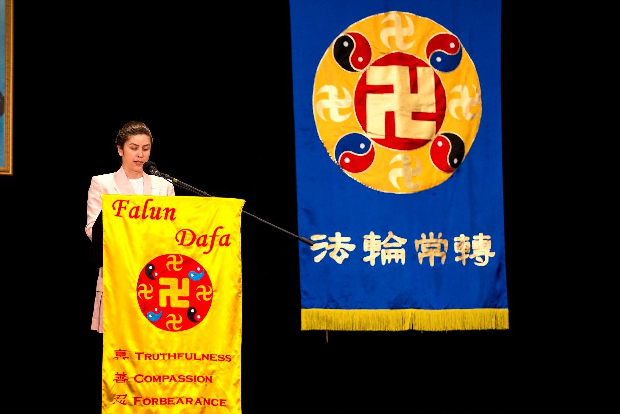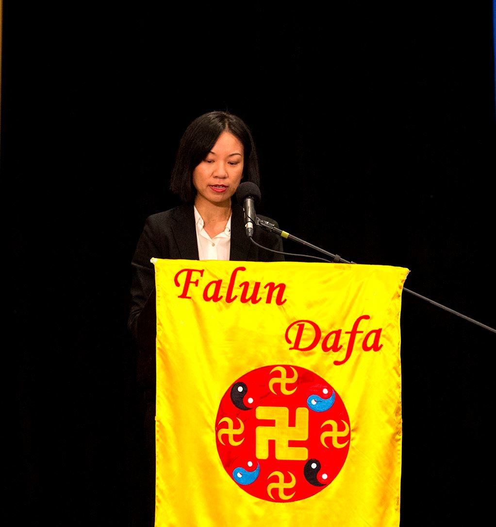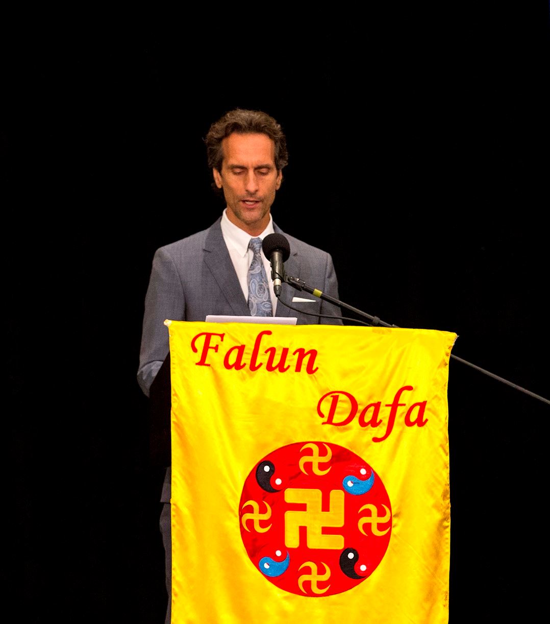 法会开幕后,加拿大法轮大法学会会长李迅以中英文宣读了三遍师尊发来的贺词,全场响起热烈不息的掌声。贺词中师尊叮嘱并勉励弟子:“大家把剩下的事做好,用你无悔的修炼过程走向未来。祝你们会有所悟、会有所成!”