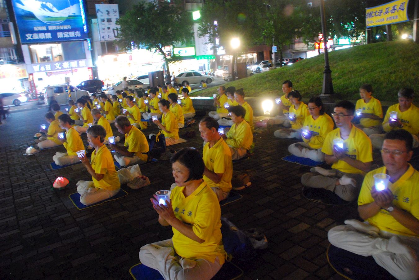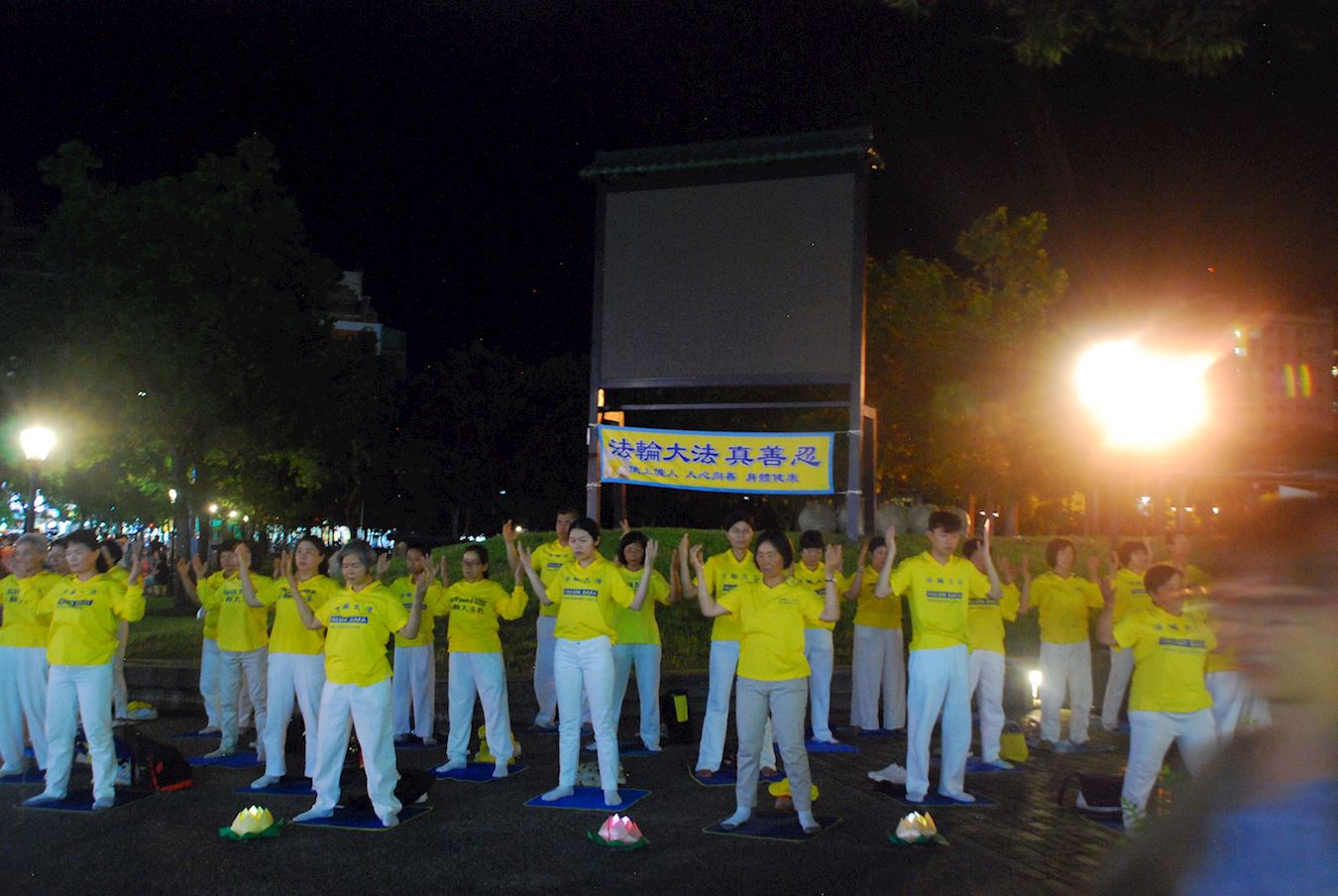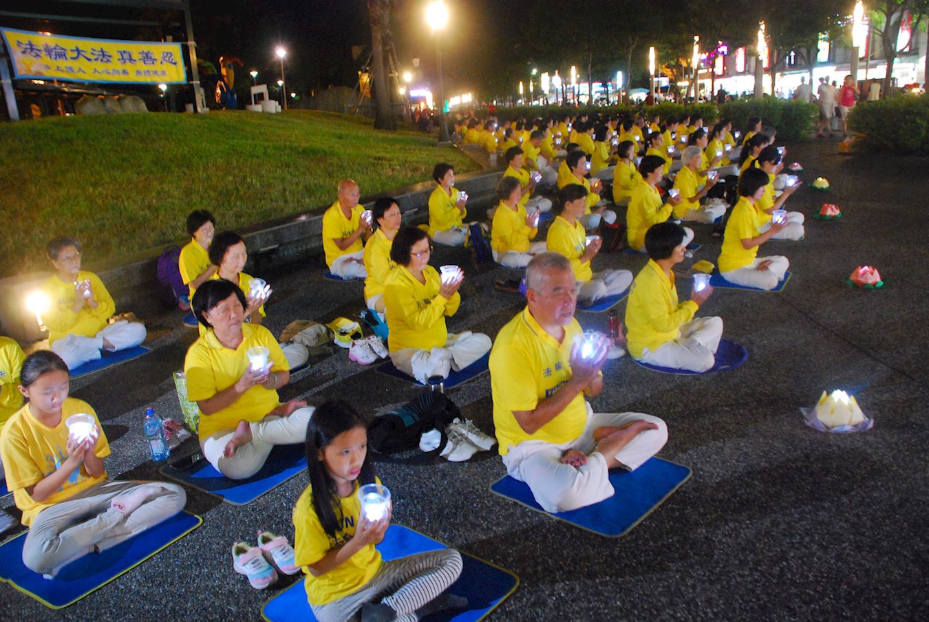 华灯初上,法轮功学员演炼五套功法后,队伍旁边摆着莲花灯,学员手举蜡烛,悼念被迫害致死的法轮功学员,场面肃穆感人。