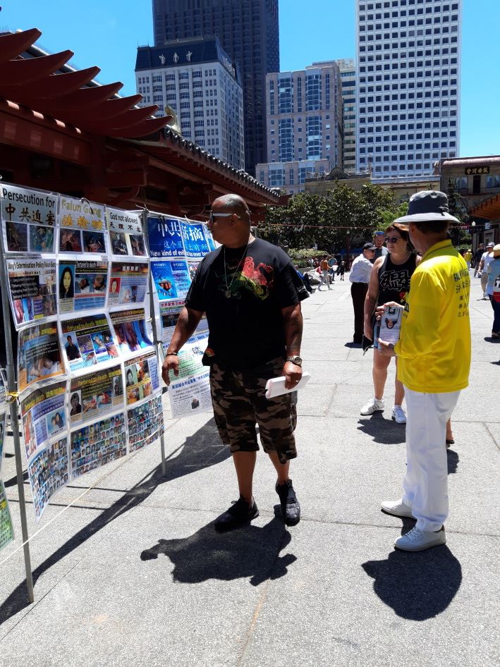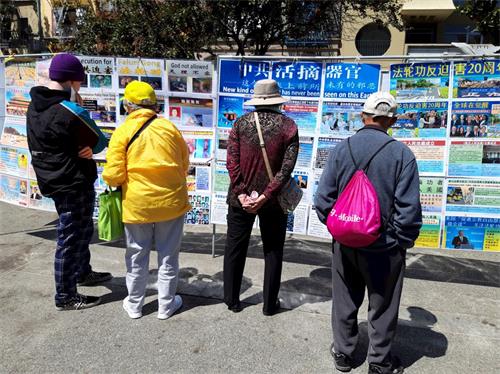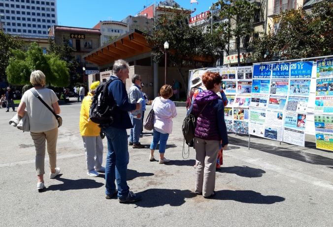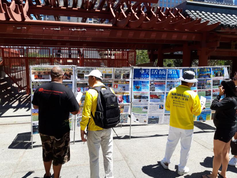 中国城花园角是当地华人聚集和游客观光的地方,观看真相展板的民众络绎不断,他们有的用手机拍照,许多民众从头到尾仔细阅读每一张真相图片,有的看了一遍还不够,连续看第二遍。也有的看完真相展板后,跟学员诉说中共的坏,还有的声明三:退.(退出中共邪*党-、团、队)。