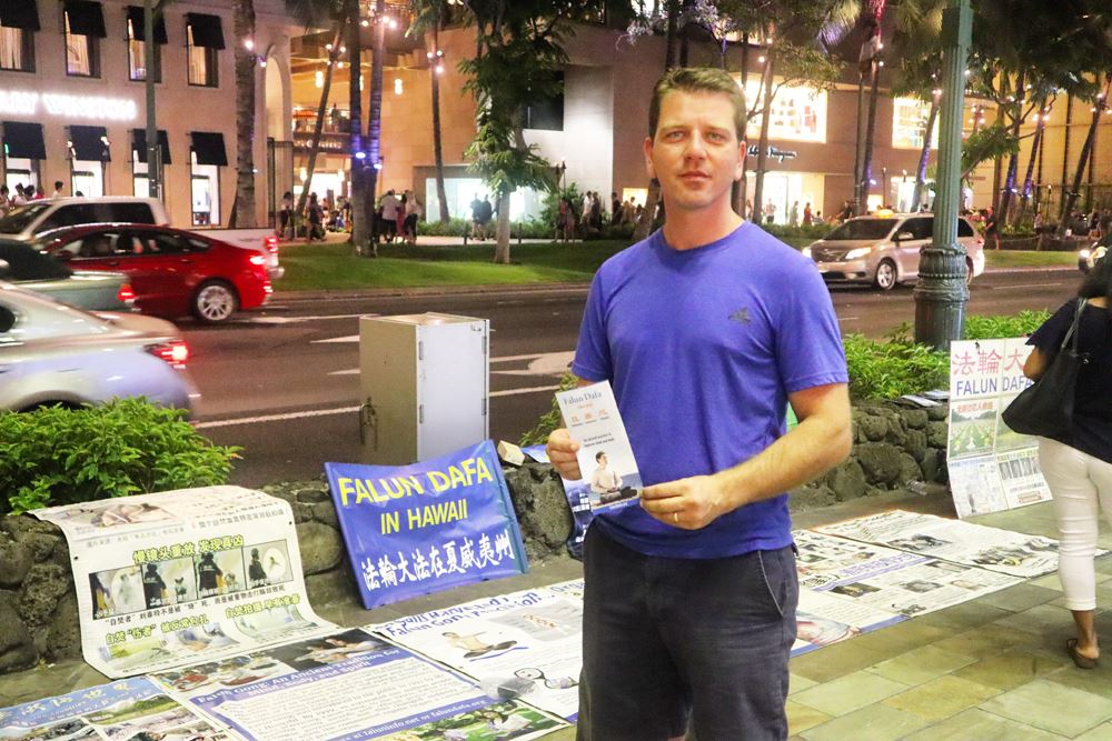 很多游客被法轮功学员所吸引,对法轮功从不想了解到驻足倾听、从不知道法轮功是什么到想要学功、有的人走到这里就是专门为了告诉法轮功学员他们已经在网上了解到真相并支持法轮功学员的义举;有的人听完真相后很感动,送给法轮功学员当地很有名的特产“用鸡蛋花的鲜花做的花环(Leis)”戴在法轮功学员的胸前,这是夏威夷当地的一种文化习俗,赠送花环是表达祝福的一种重要方式。