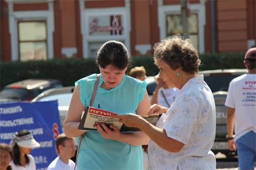 七月二十一日,在车里雅宾斯克市(Chelyabinsk)法轮功学员打出展板向人们介绍法轮功,发放真相资料。