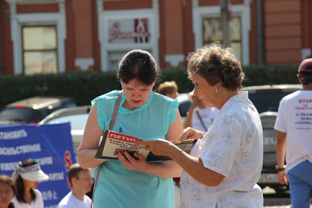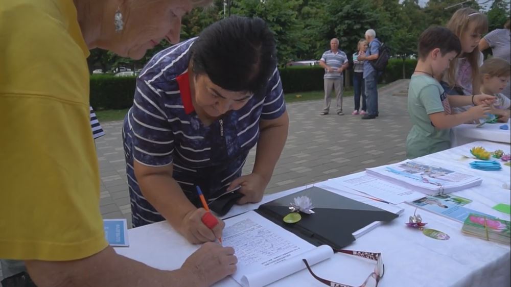 大学生维克多利亚(victoliya)说道:“今天是七月二十日,我签名抗议中国共产党迫害法轮功学员。”阿伊莎特(Aishat)是一位教师,她说:“我抗议活摘(法轮功学员)器官,所以今天七月二十日,我签名抗议这种灭绝人性的做法。”一位年轻的军人听说了真相后,表示要告诉自己身边的所有亲戚朋友也来签字制止迫害,他觉得路过的每一位行人都有义务签名共同制止迫害。