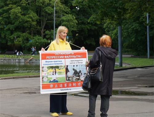 二零一九年七月二十日,从早上九点开始的在莫斯科中使馆前的单人抗议接力活动持续十二小时,一直到晚上九点结束。法轮功学员手持展板要求停止对法轮功学员的虐杀迫害和活摘器官的罪行。同时集体炼功、发放真相资料向市民讲述法轮功修炼者在中国被迫害的情况。