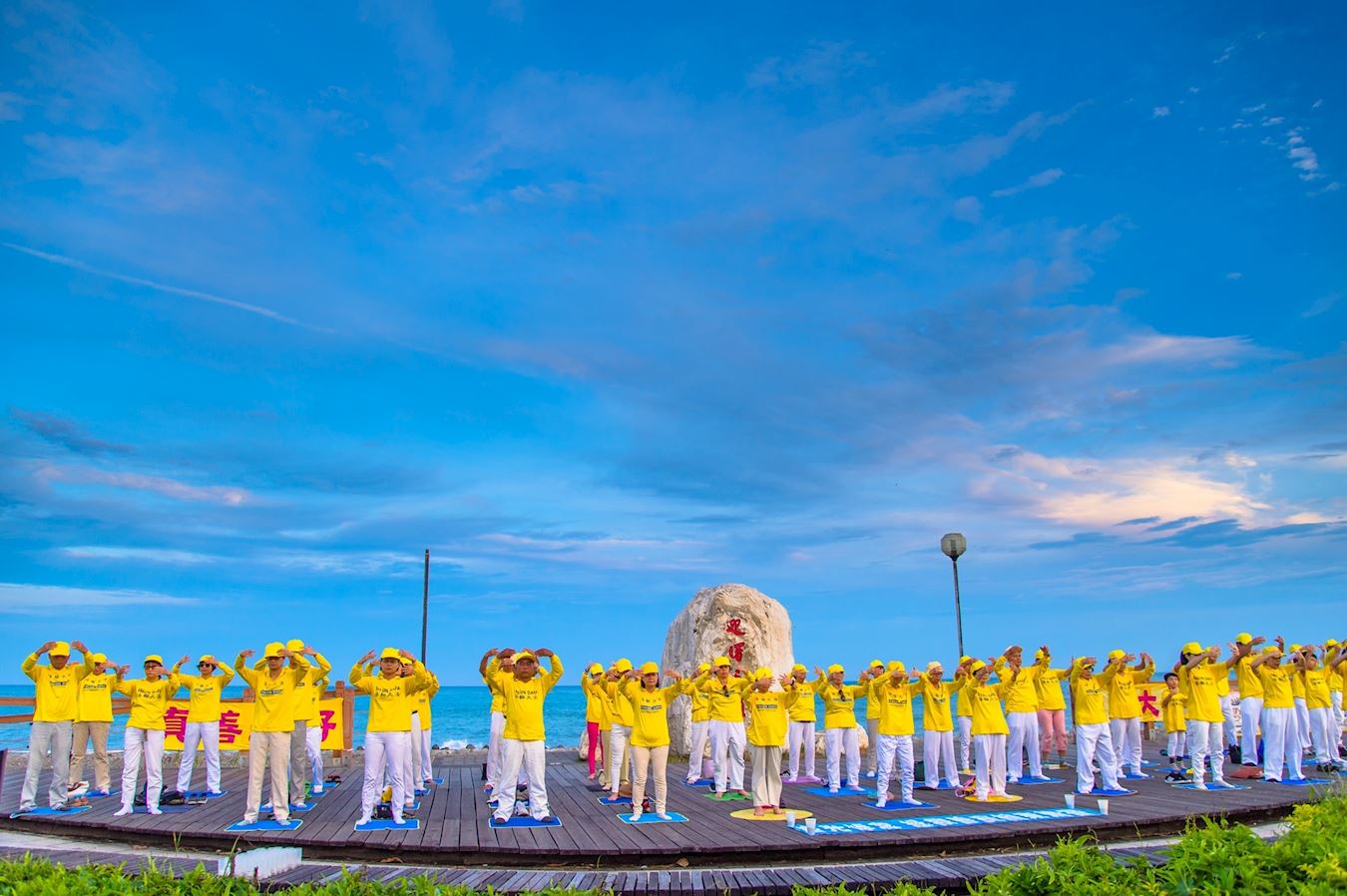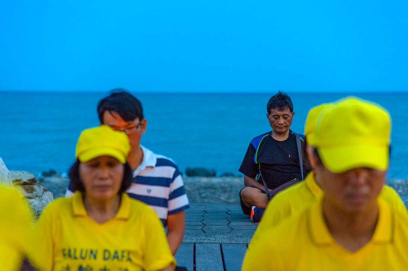 台东海滨公园濒临太平洋,是游憩景点,法轮功学员黄昏时在“迎曙之滨”地标前集体炼功,吸引了许多游客,有人用手机拍照,并询问如何学炼。有民众说感受到法轮功这个炼功场非常祥和舒服。