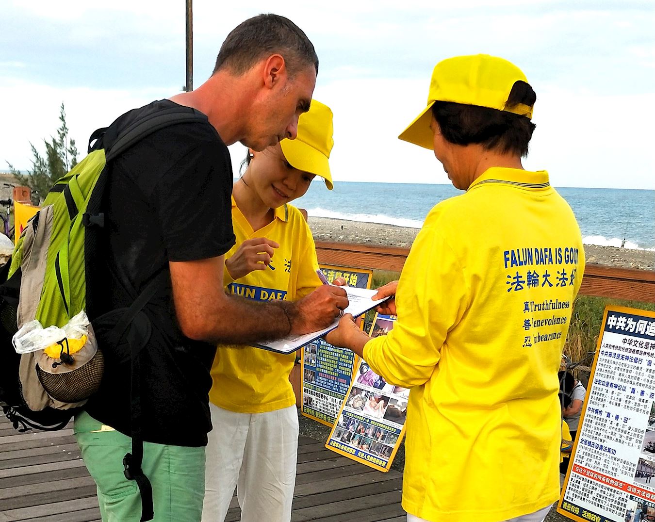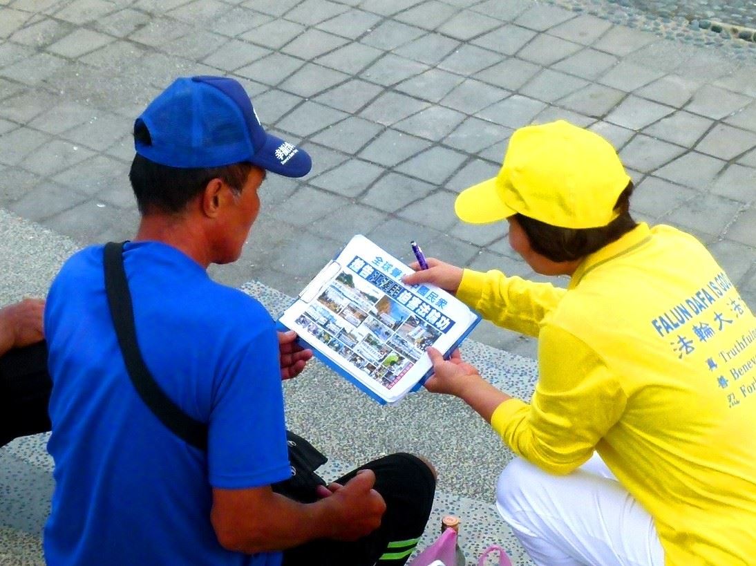 路过的市民黄先生签名支持法轮功反迫害后,主动全程参加烛光悼念会表达支持。黄先生表示,他在军中服务了三十年,今天是他退伍的第一天,约了朋友到海边小聚,很幸运接触到法轮功。与法轮功学员坐在一起,他表示能亲身感受到这个场非常祥和美好。他留下联络方式,表示要进一步学炼法轮功。
