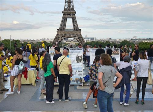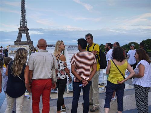 图1~2:二零一九年七月二十日傍晚,法轮功学员在巴黎人权广场静坐,纪念被中共致死的法轮功同修。