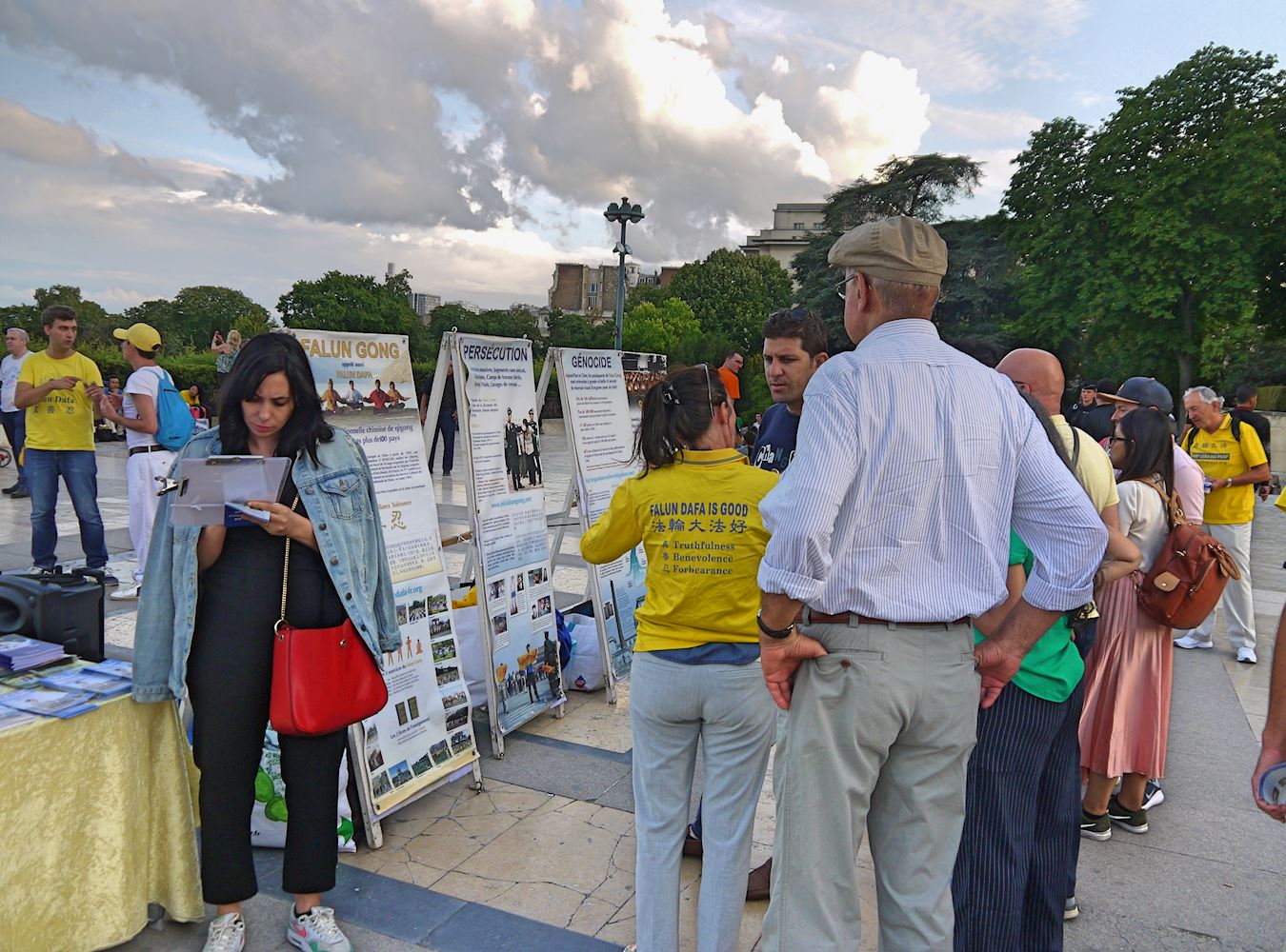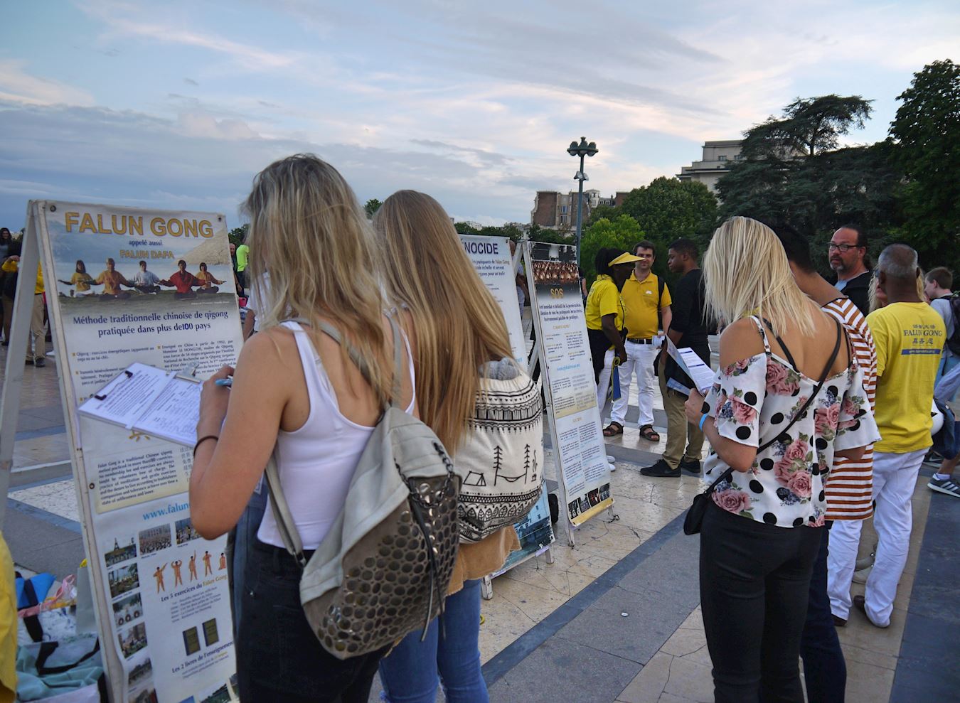 夜幕降临,清风吹拂,游人仍然很多。人们观看展板,了解法轮功的信息以及无辜被迫害的真相后,都愤愤不平,有人问:“这么大的一件事,为什么电视新闻里不报道?”还有人问如何能帮助受迫害的法轮功学员。很多人在反迫害征签表上签字,支持法轮功。