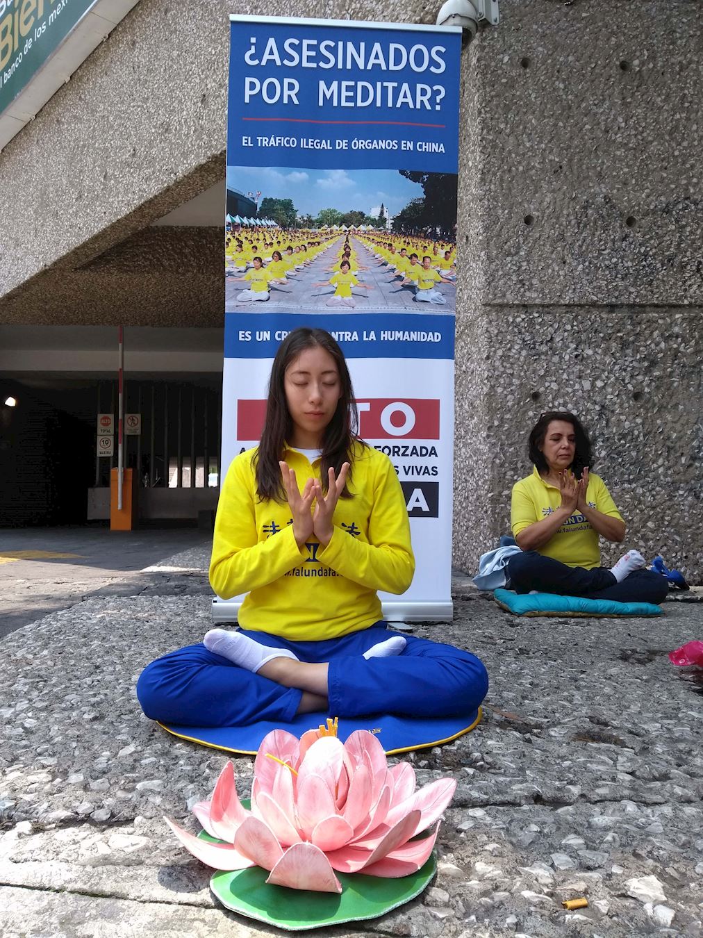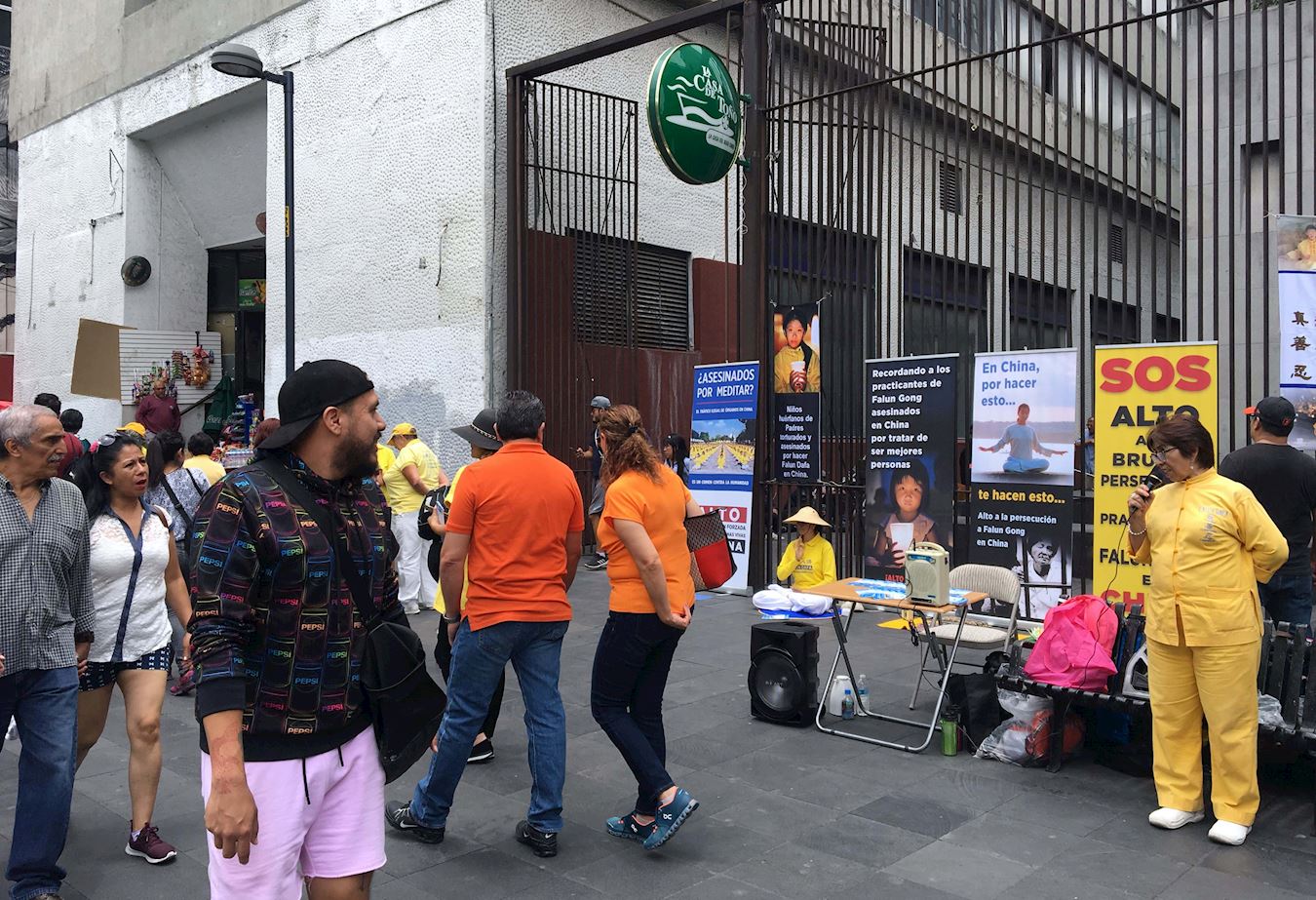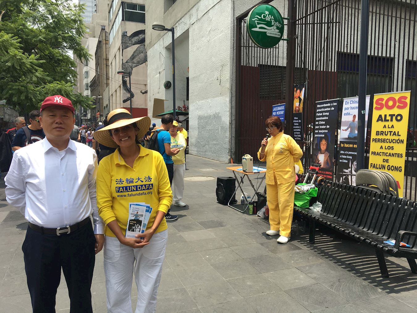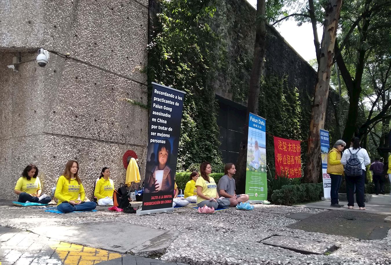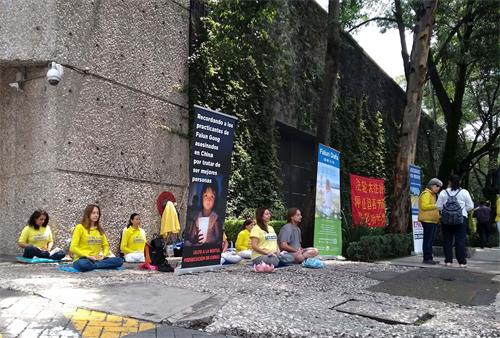 七月十九日,法轮功学员在墨西哥城中共领事馆外集会,炼功、讲真相。