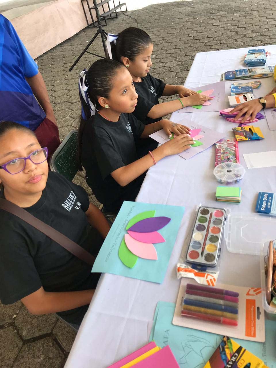 有两个小女孩向路人出售蛋白甜饼。一名学员向她们介绍大法,她们很快就迷上了学画莲花。