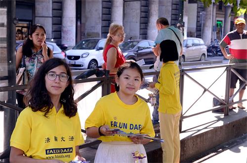 二零一九年七月二十日是法轮功反迫害二十周年,上午,在罗马维多利奥广场(Piazza Vittorio Emanuele)开展了法轮功反迫害二十周年活动,罗马维多利奥广场位于罗马华人中国城的中心地带,是当地华人聚集的地方,活动期间许多民众驻足了解,表示支持法轮功学员,也有不少人对功法表现出很大兴趣,表示要去炼功点学功。