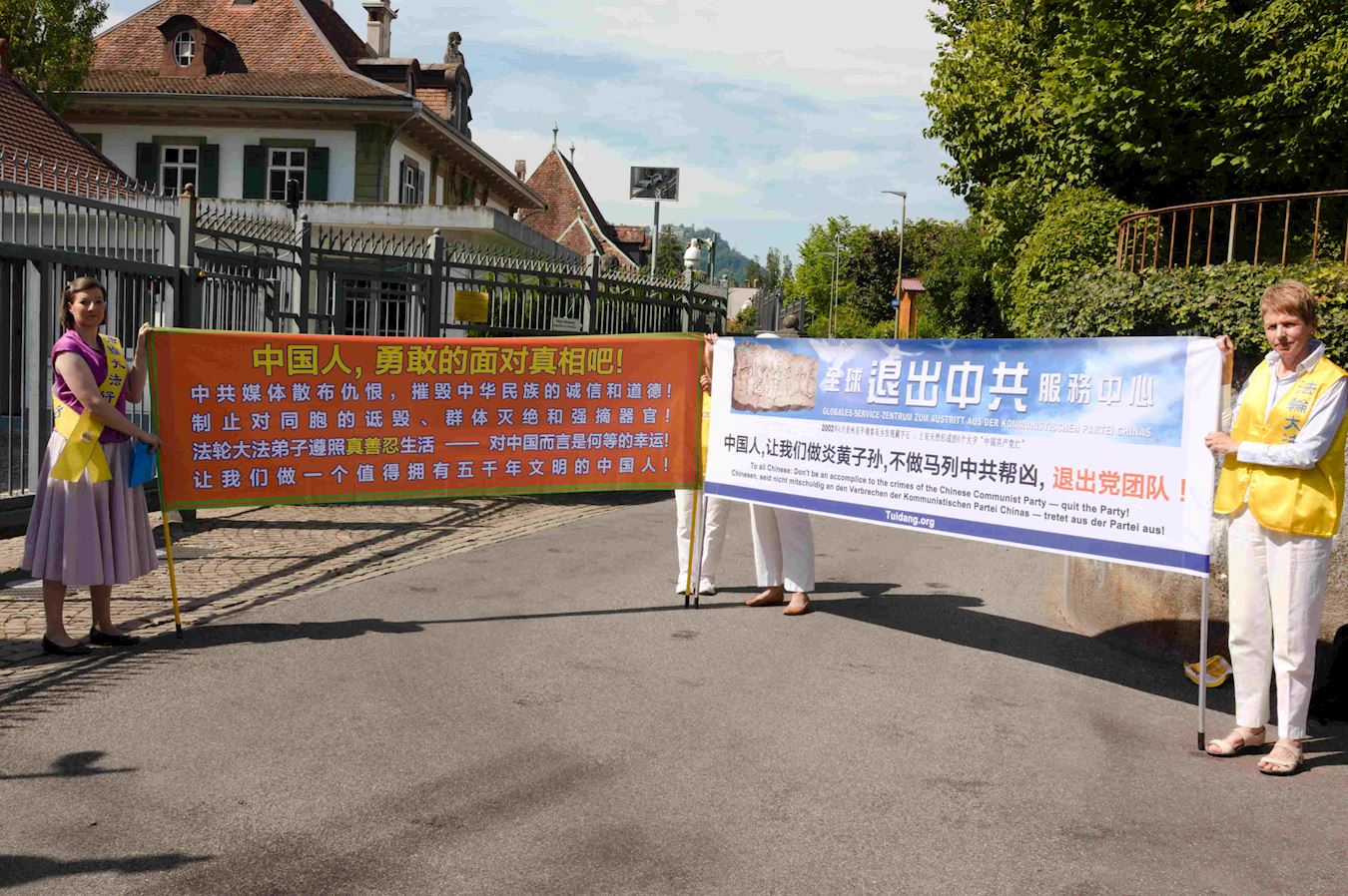 当天上午,部份法轮功学员代表来到中共驻瑞士使馆前,宣读劝善信。在信中学员们告诉使馆工作人员,世界各地法轮功学员二十年来的反迫害,除了要制止中共对法轮功的迫害,也希望那些听信中共诽谤之词的民众能够了解真实的法轮功。