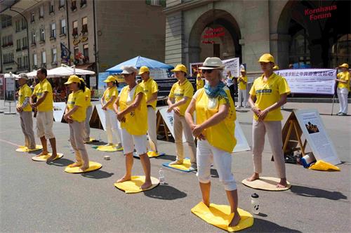 ![]() 图2~3:法轮功学员在伯尔尼市中心的Kornhaus广场演示功法 |