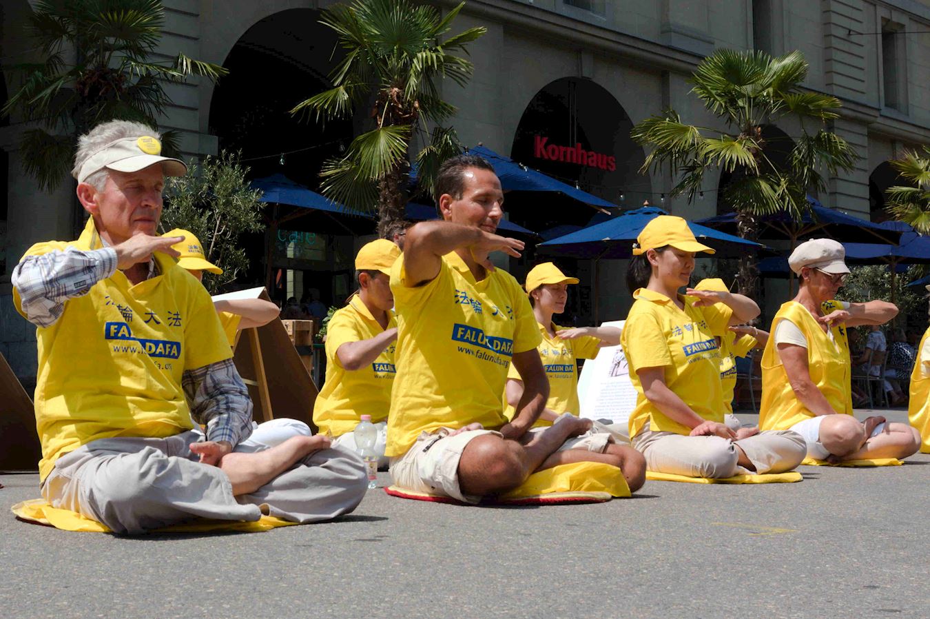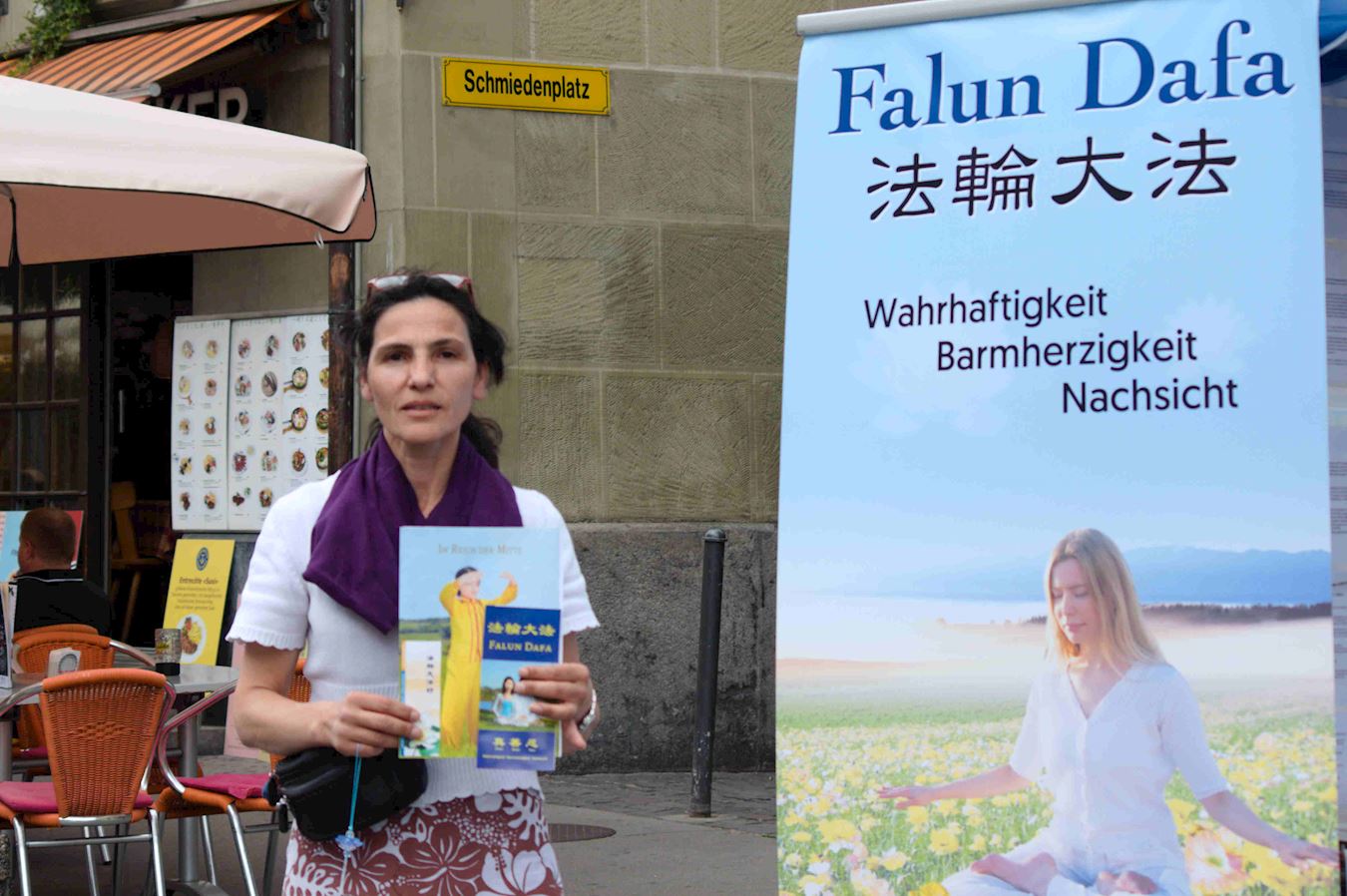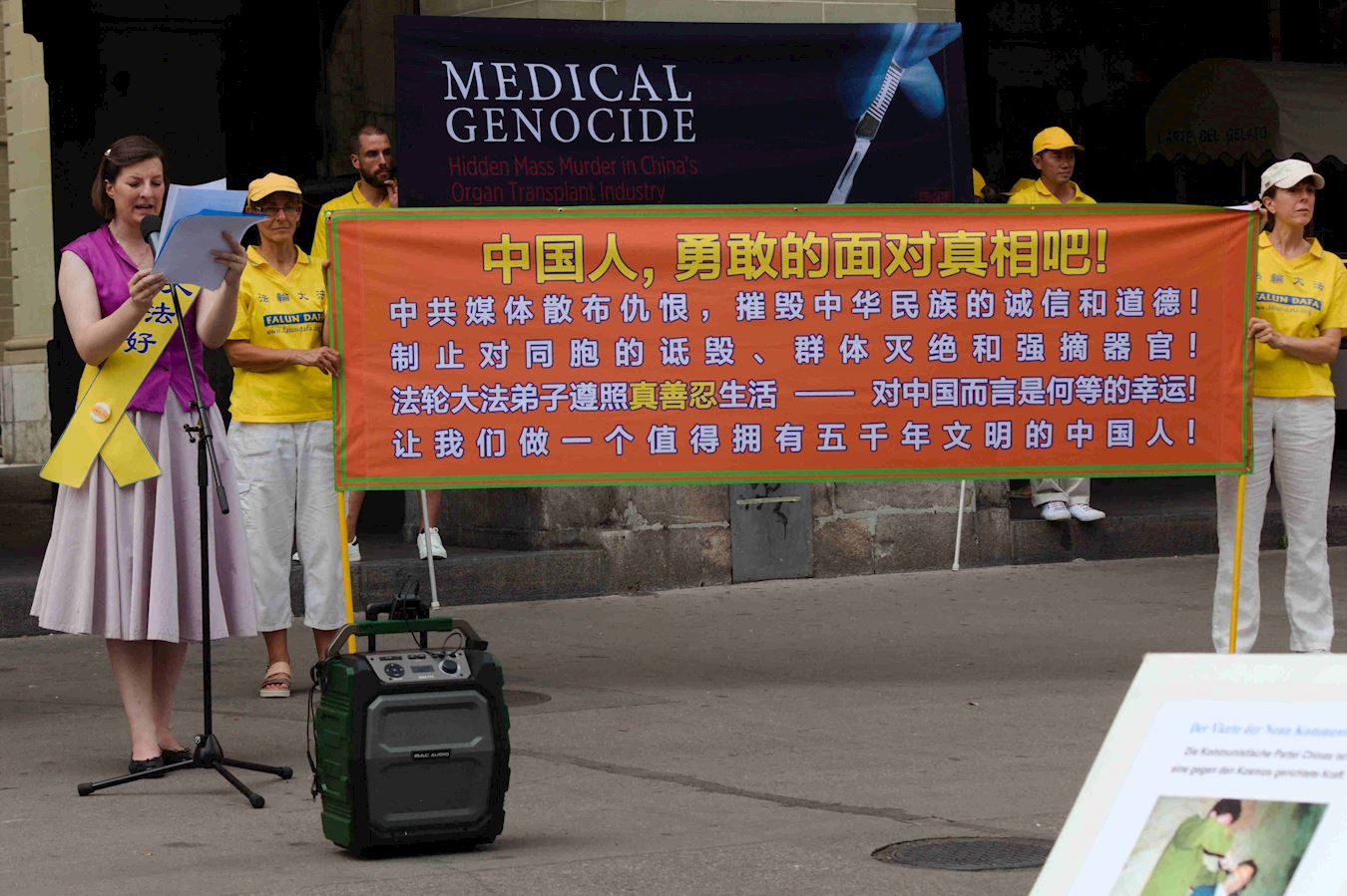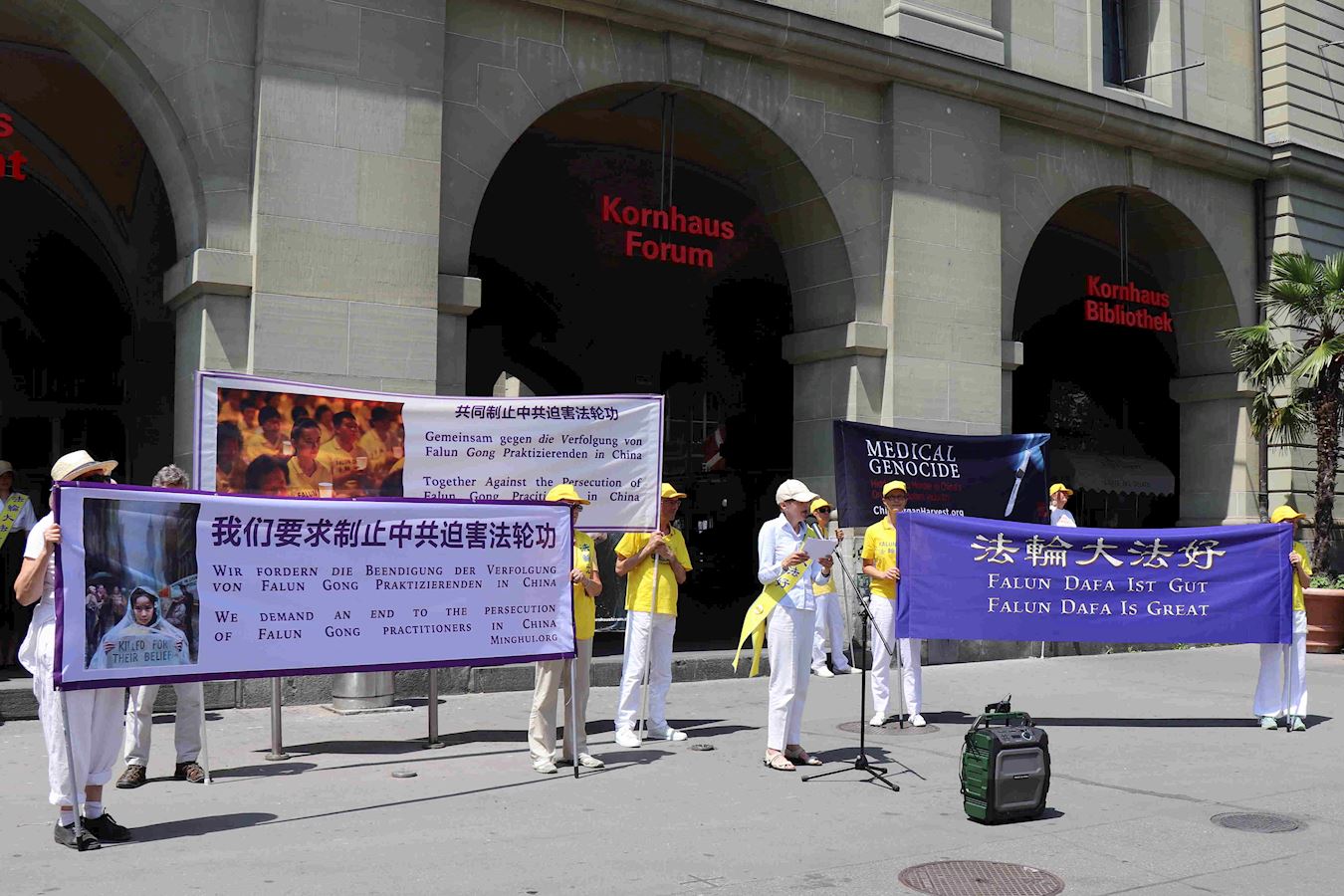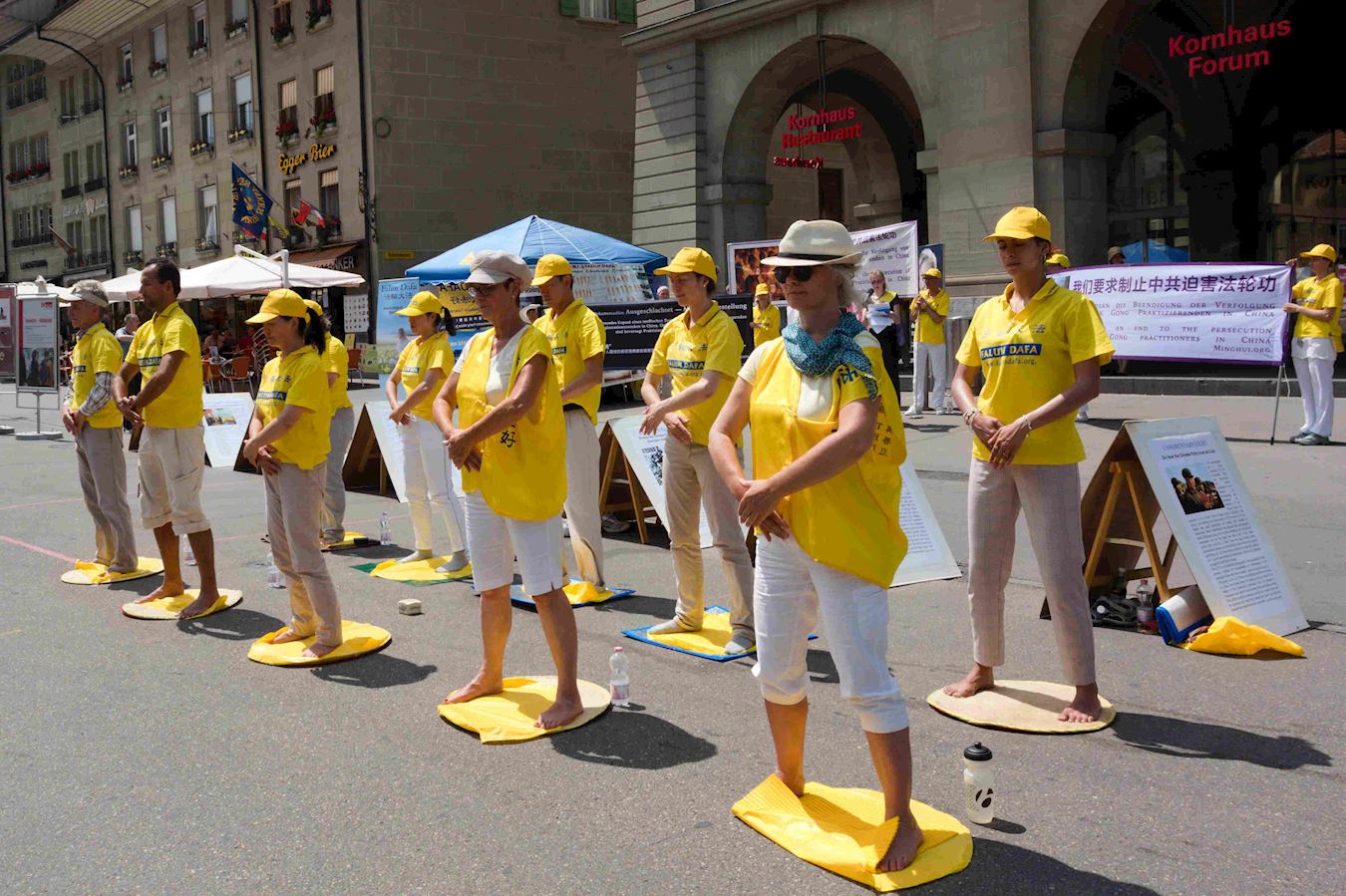 下午,法轮功学员再次聚集在首都伯尔尼市中心的Kornhaus广场,通过演讲告诉人们法轮功教人按照“真善忍”做个好人,已经弘传世界二十七年。但是中共因为惧怕上亿人以“真善忍”为准则,能自己判断好坏、对错,而不易被操控,因此在二十年前开始对法轮功学员的血腥迫害:非法关押,酷刑折磨,甚至活摘他们的器官,从中牟取暴利。