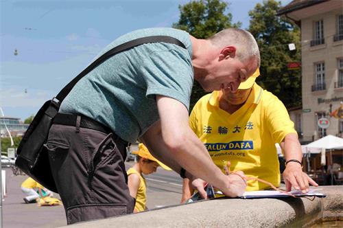 来自苏黎世的德·托马斯(De Tommasi)先生从事交通规划工作,他是在听了学员的演讲后主动来签名的。他谈到:“我听到了演讲中的介绍,我认为迫害非常糟糕,法轮功学员非常平和,不能因为他们打坐及他们的信仰而迫害他们。这根本就不该存在,不论是在中国还是在世界任何一个地方,都不应该有这样的迫害。”