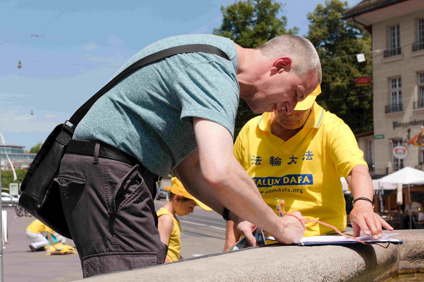 学员们安静祥和的功法演示吸引众多路人驻足观看,有的接过真相讯息,有的在和学员交谈后当即签名要求瑞士联邦政府帮助制止中共迫害法轮功及活摘器官的罪行,还有的是在阅读真相资料后又返回活动地点,签名支持法轮功。