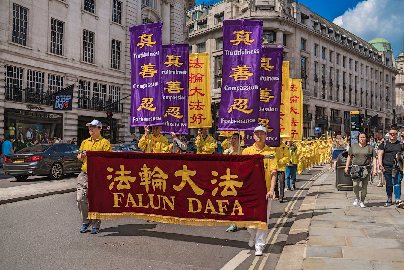信息明了的真相横幅、舒缓祥和的功法演示、悼念被迫害致死法轮功修炼者的白衣方队,加上在游行队伍两侧发放法轮功真相传单并面对面讲真相的法轮功学员,“反迫害二十周年”游行队伍在伦敦市中心的人流中行进,传递真相、彰显正义、汇聚良知。游行队伍经过之处,不断出现被中共迫害法轮功真相所震惊的观众,仍有很多人表示第一次听说法轮功。“反迫害二十周年”游行队伍两次绕行伦敦唐人街,吸引更多中国人正视法轮功的目光,吸引那些对中国感兴趣的人开始关注法轮功。