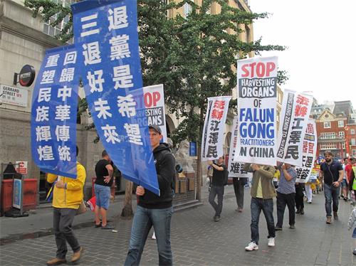 游行队伍从中使馆对面法轮功二十四小时反迫害真相点出发,行进于摄政街(Regent Street )、皮卡迪利大街(Piccadilly Street)等伦敦市中心的主要街道,两次环绕伦敦唐人街,途径英国广播公司BBC总部、牛津街圆环(Oxford Circus)、皮卡迪利圆环(Piccadilly Circus)等著名景点和地标,最终来到圣马丁广场。
