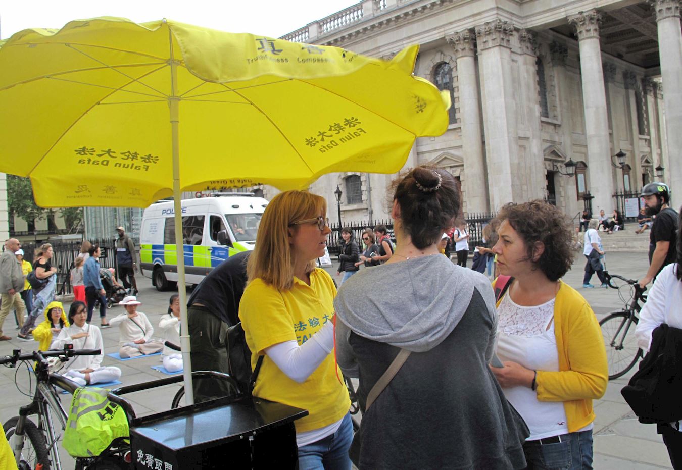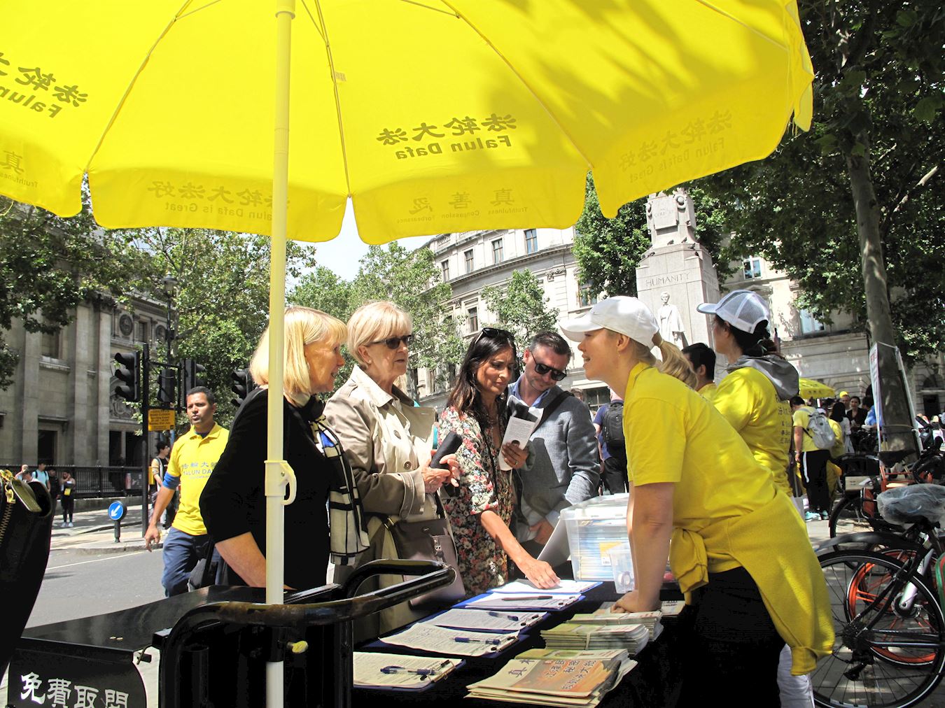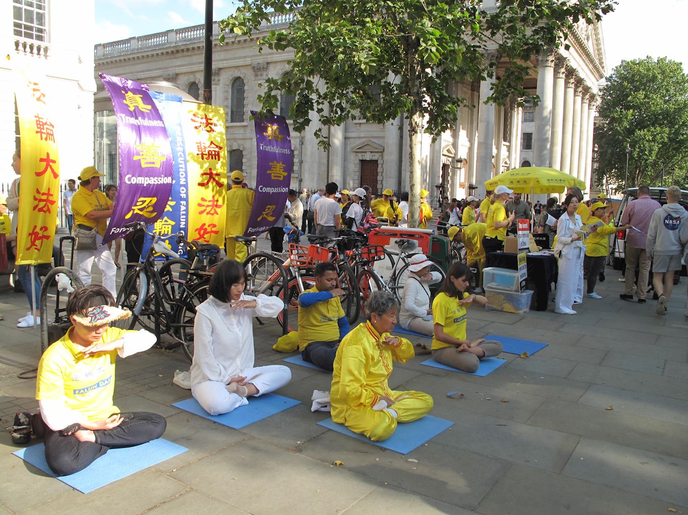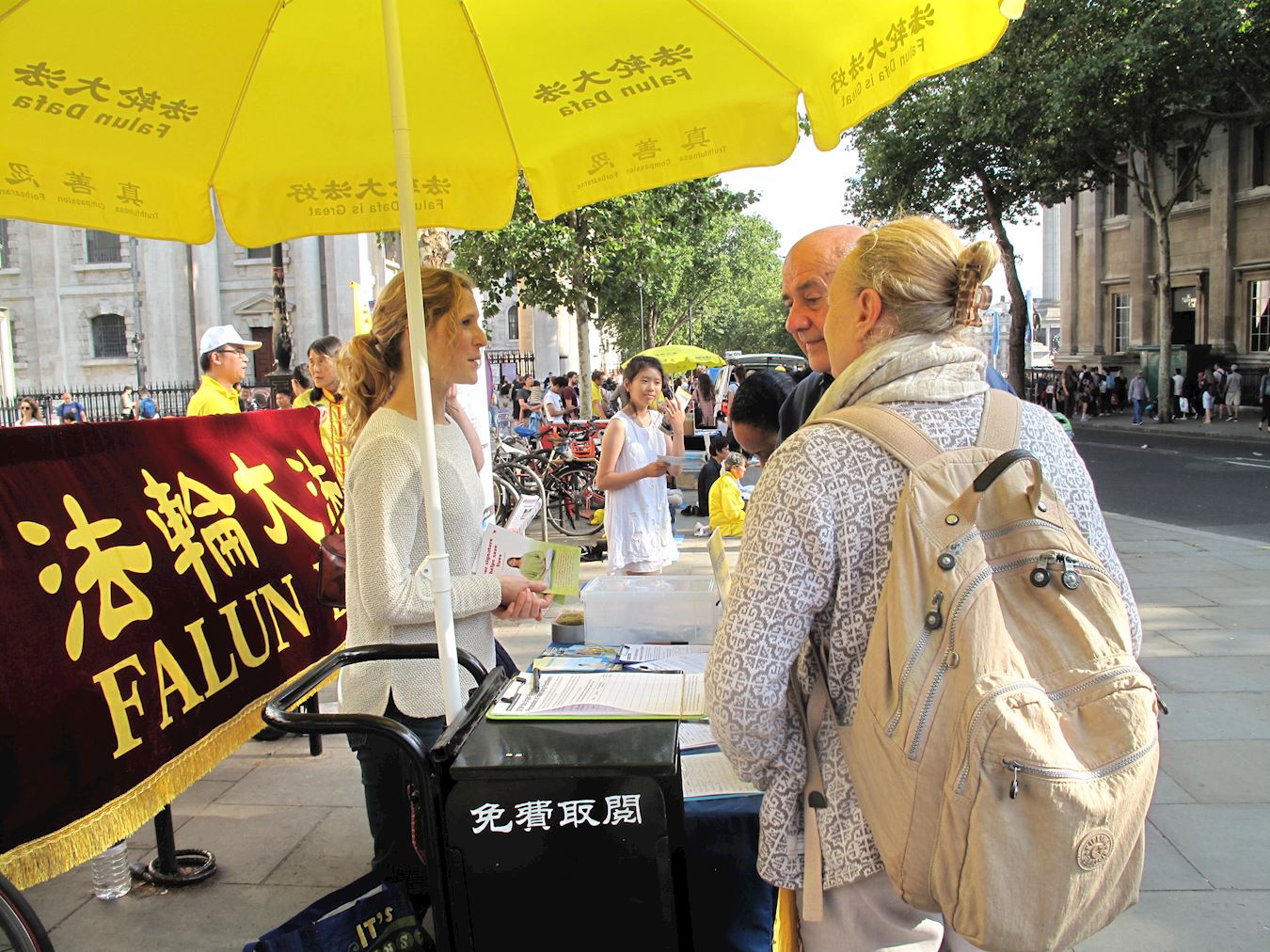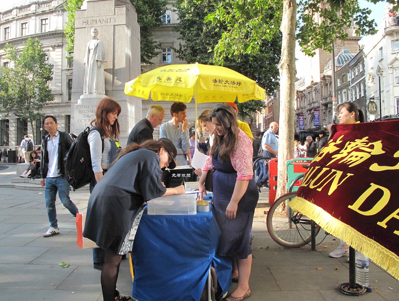 “反迫害二十周年”法轮功游行结束后,法轮功学员在伦敦圣马丁广场集会,举行新闻发布、集体炼功、发传单、讲真相、征签反迫害。广大民众驻足了解真相,明白真相的民众纷纷签名支持制止迫害。