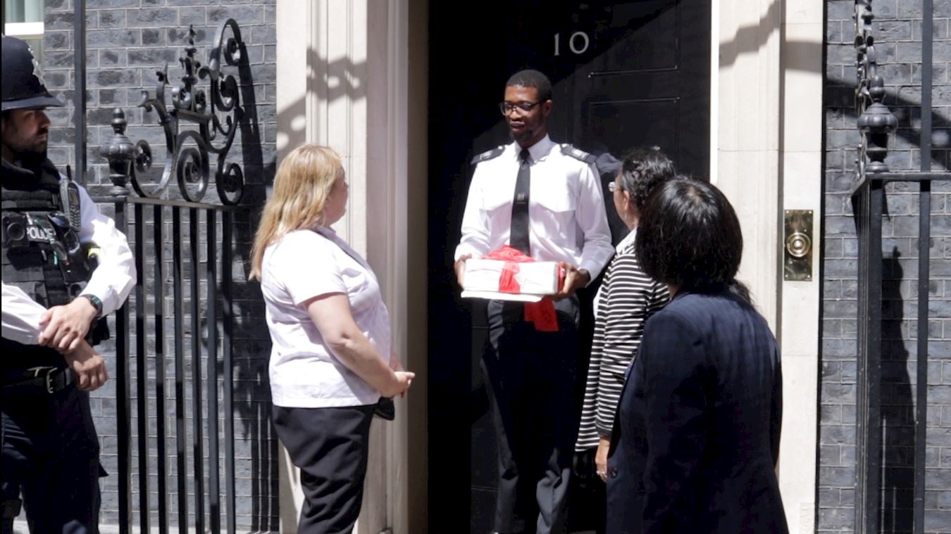 在唐宁街10号向英国首相递交呼吁信和反迫害请愿联署签名