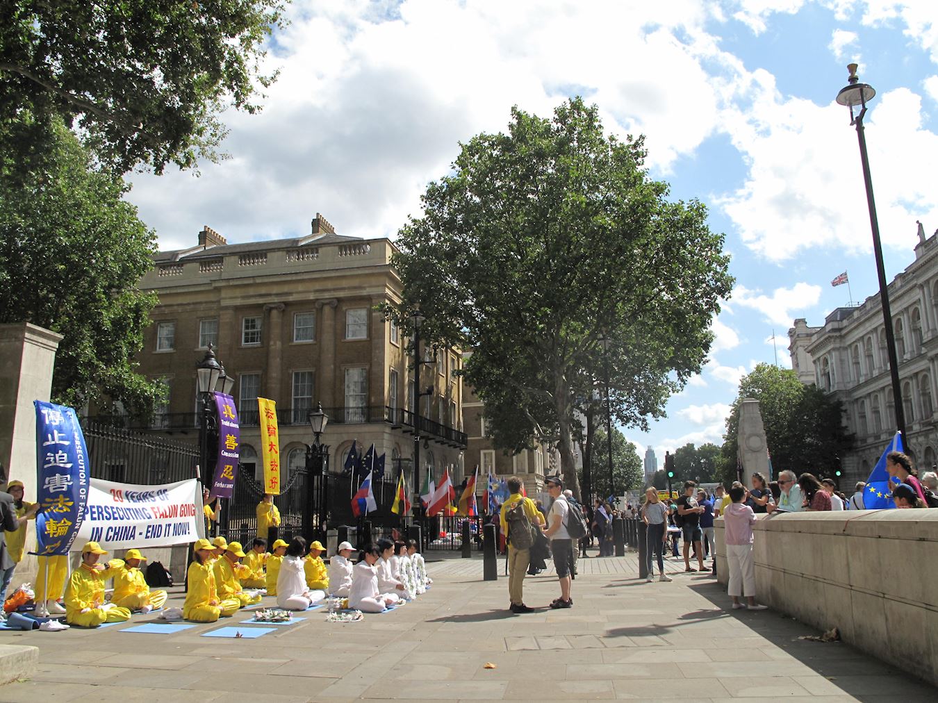 当天在英国首相府外白厅大街上有大规模抗议活动,法轮功学员平和的真相展示与反迫害信息吸引了众人目光,很多人接过传单,不断有人在反迫害征签表上签名。英国学员斯图尔特(Stewart)表示:“中共对法轮功的迫害是一场人间的悲剧,二十年太长,必须制止。”