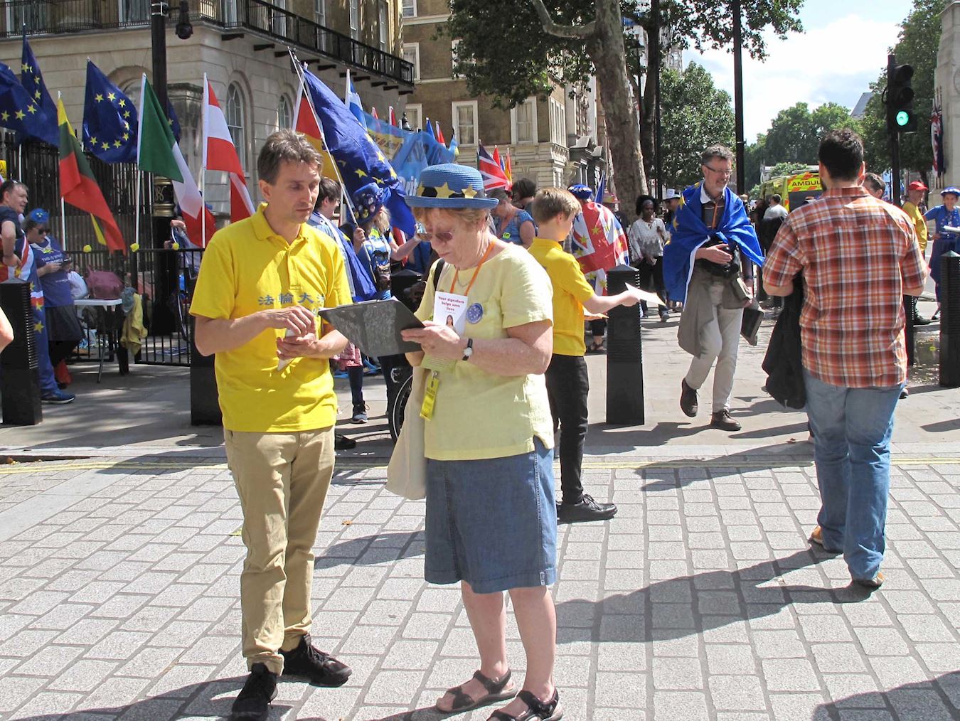 ![]() 图19~20:二零一九年七月二十日下午,法轮功学员在唐宁街10号首相府前集体炼功、发传单、讲真相、征签反迫害 |