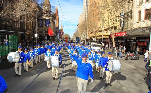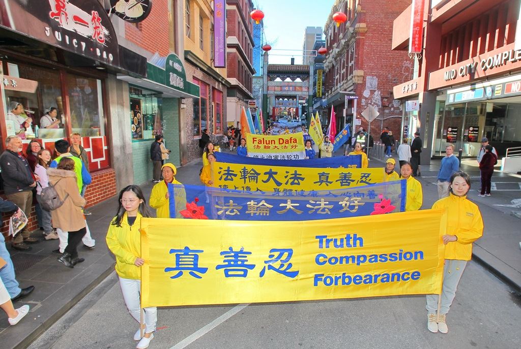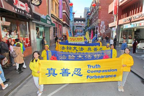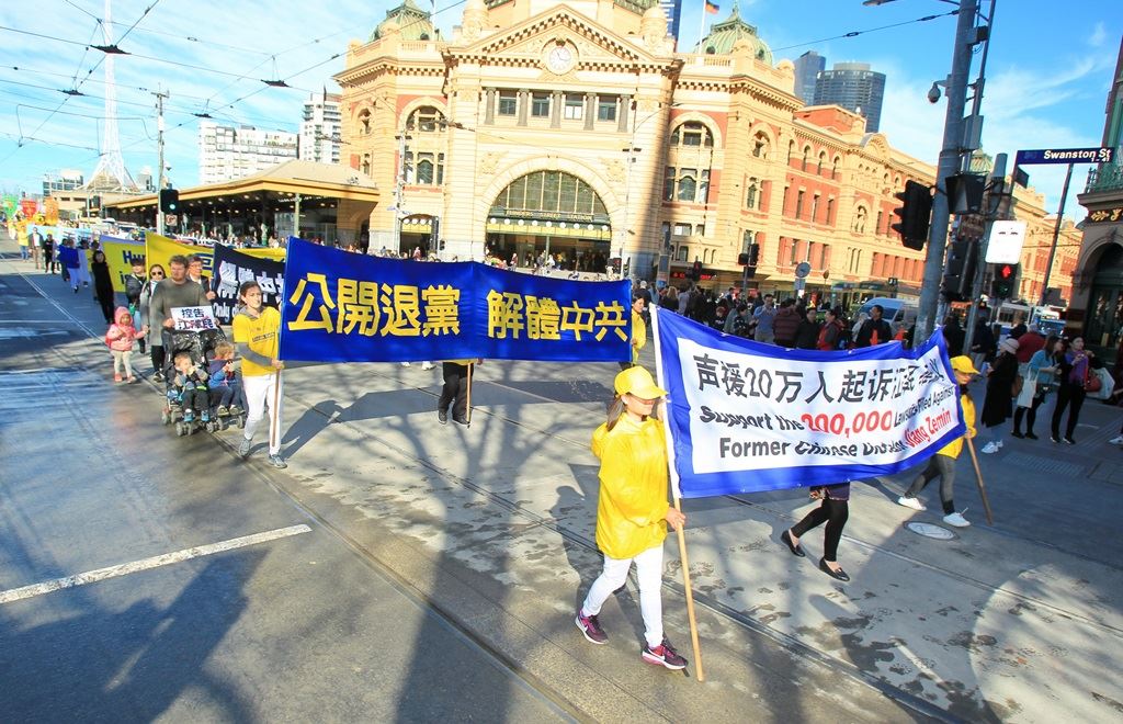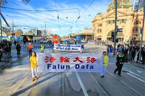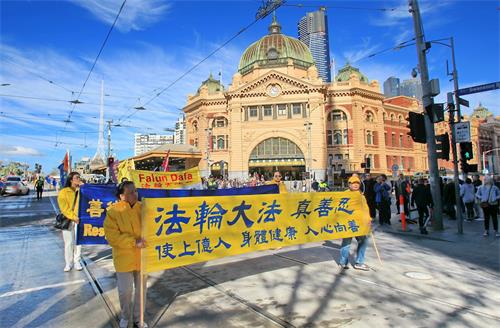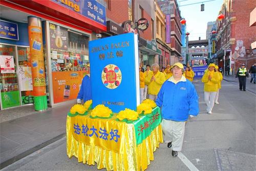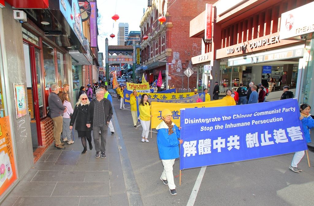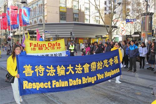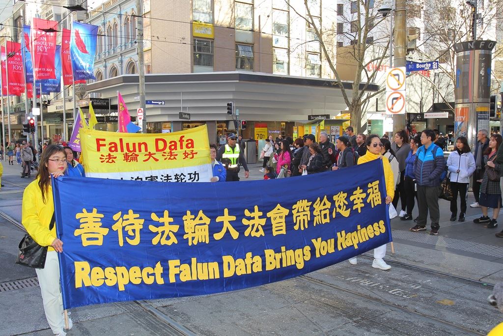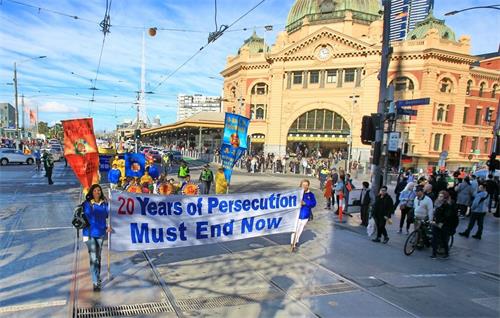 游行队伍共四个方阵,以天国乐团为先导,其后分别是“法轮大法好、大法洪传”、“解体中共结束迫害”、“退!党!保平安”等方阵,把法轮大法的美好、法轮功和平反迫害二十年的历程展现给墨尔本民众。