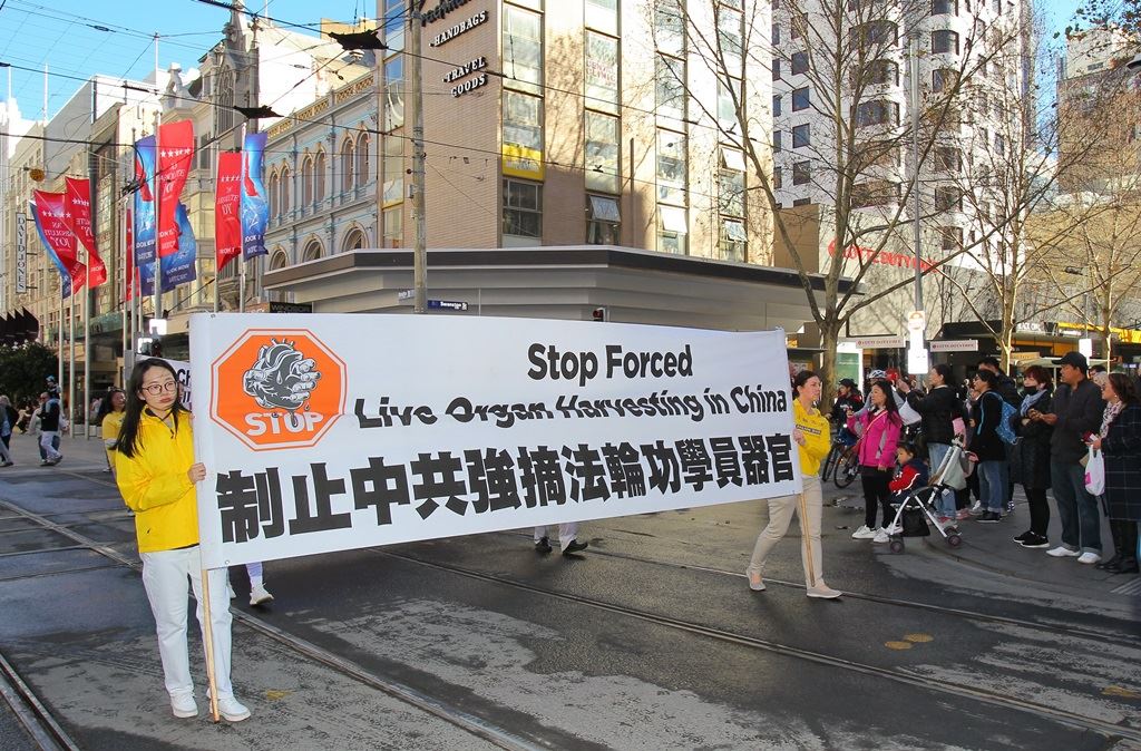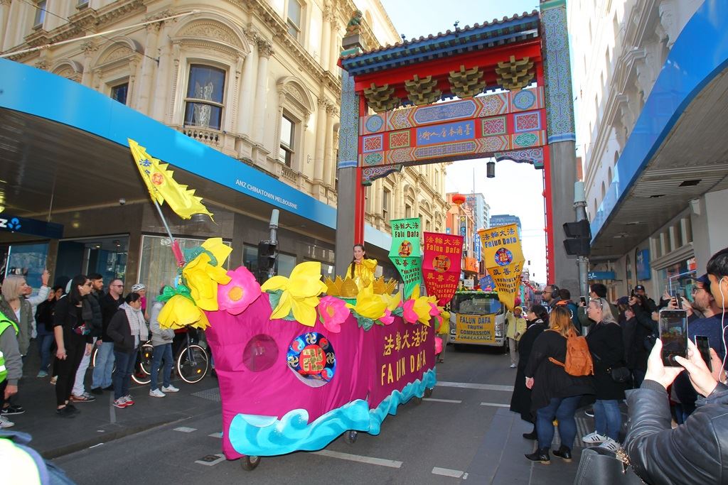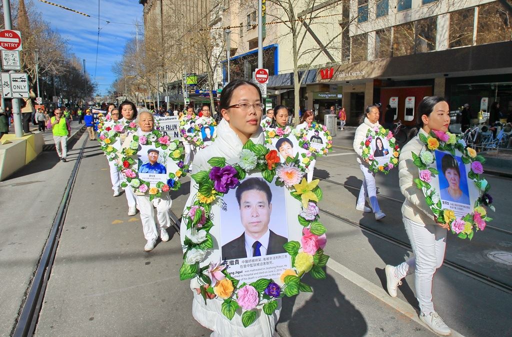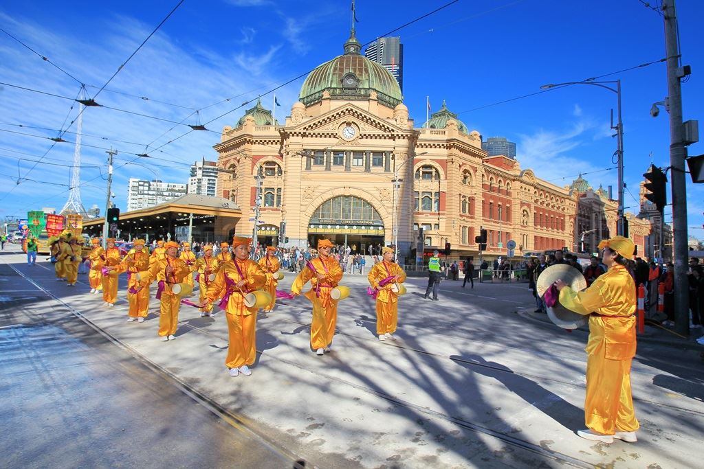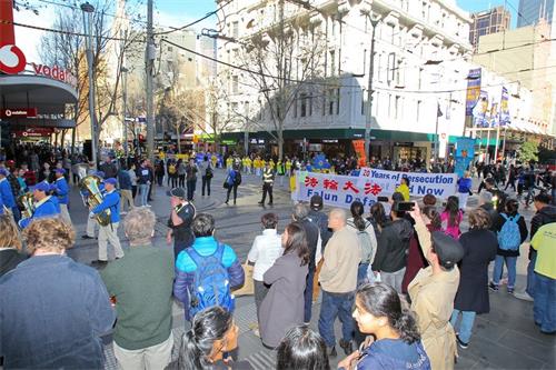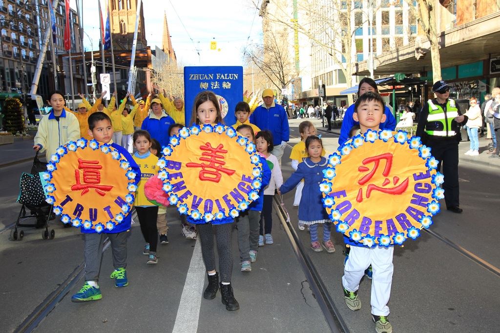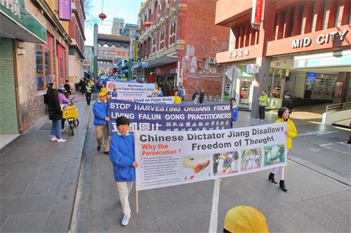 游行队伍共四个方阵,以天国乐团为先导,其后分别是“法轮大法好、大法洪传”、“解体中共结束迫害”、“退!党!保平安”等方阵,把法轮大法的美好、法轮功和平反迫害二十年的历程展现给墨尔本民众。